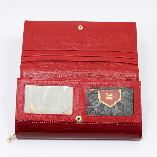 - Dużej wielkości damski portfel odszyty z naturalnej skóry o lakierowanym wykończeniu w czerwonym kolorze. Model w orientacji poziomej, zamykany na zatrzask. W środku duża ilość praktycznych przegródek i schowków. Zabezpieczony systemem RFID.