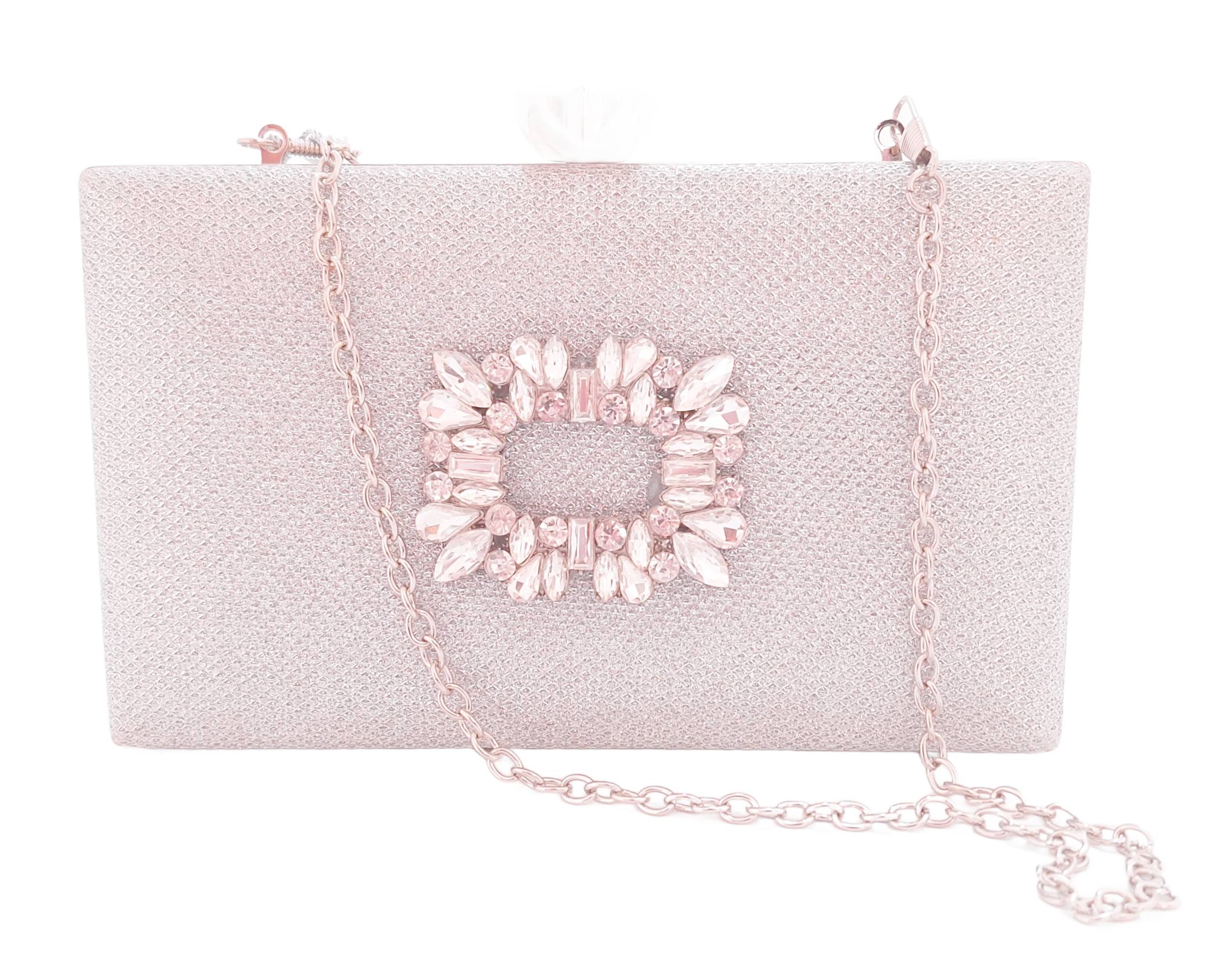 Mała elegancka torebka w formie sztywnego puzderka to idealny dodatek do eleganckich kreacji. Torebka pokryta jest połyskującym brokatowym materiałem syntetycznym. Zapięcie na metalowy elegancki zatrzask gwarantuje bezpieczeństwo Twoich drobiazgów. Centralnym elementem jest efektowna ozdoba z błyszczących kryształków, która nadaje torebce luksusowy charakter. Wyposażona w dwa odpinane łańcuszki, dzięki czemu możesz nosić ją na dwa sposoby: w dłoni jako klasyczną kopertówkę lub przewieszoną przez ramię – w zależności od okazji.