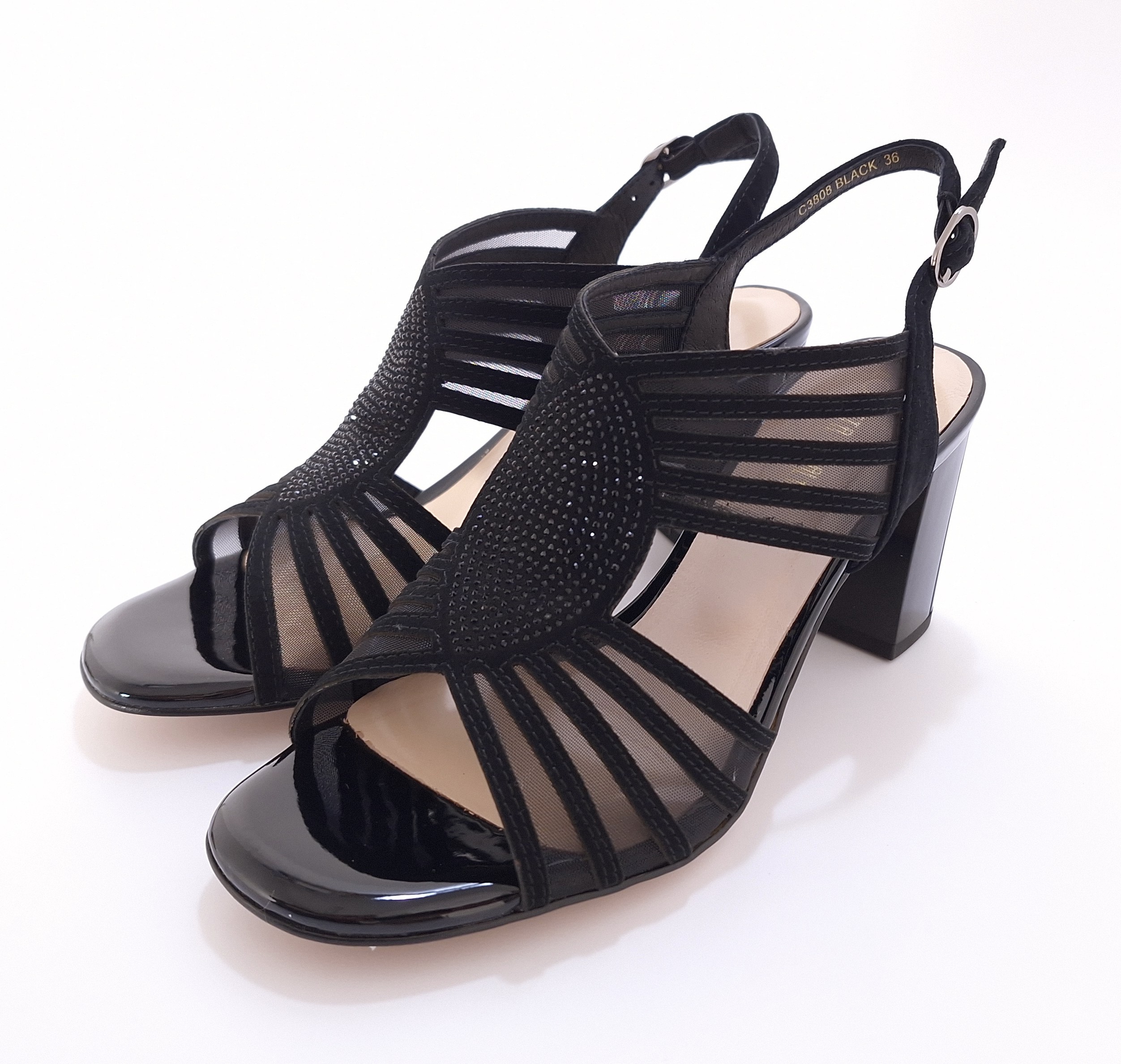 - Eleganckie czarne sandały Loretta Vitale z naturalnej skóry zamszowej. Stabilny obcas, siateczka i dżety. Idealne na co dzień i specjalne okazje.