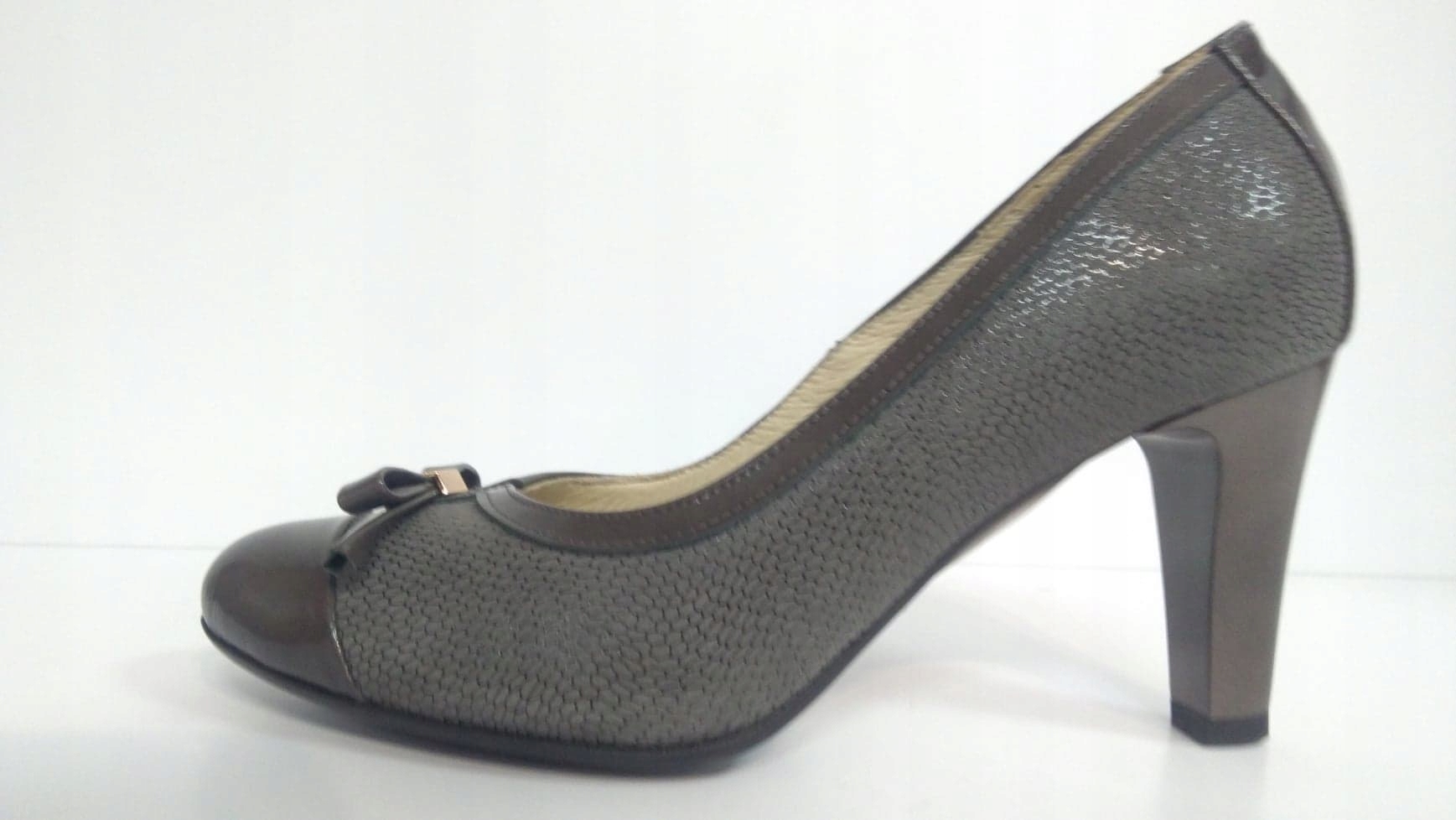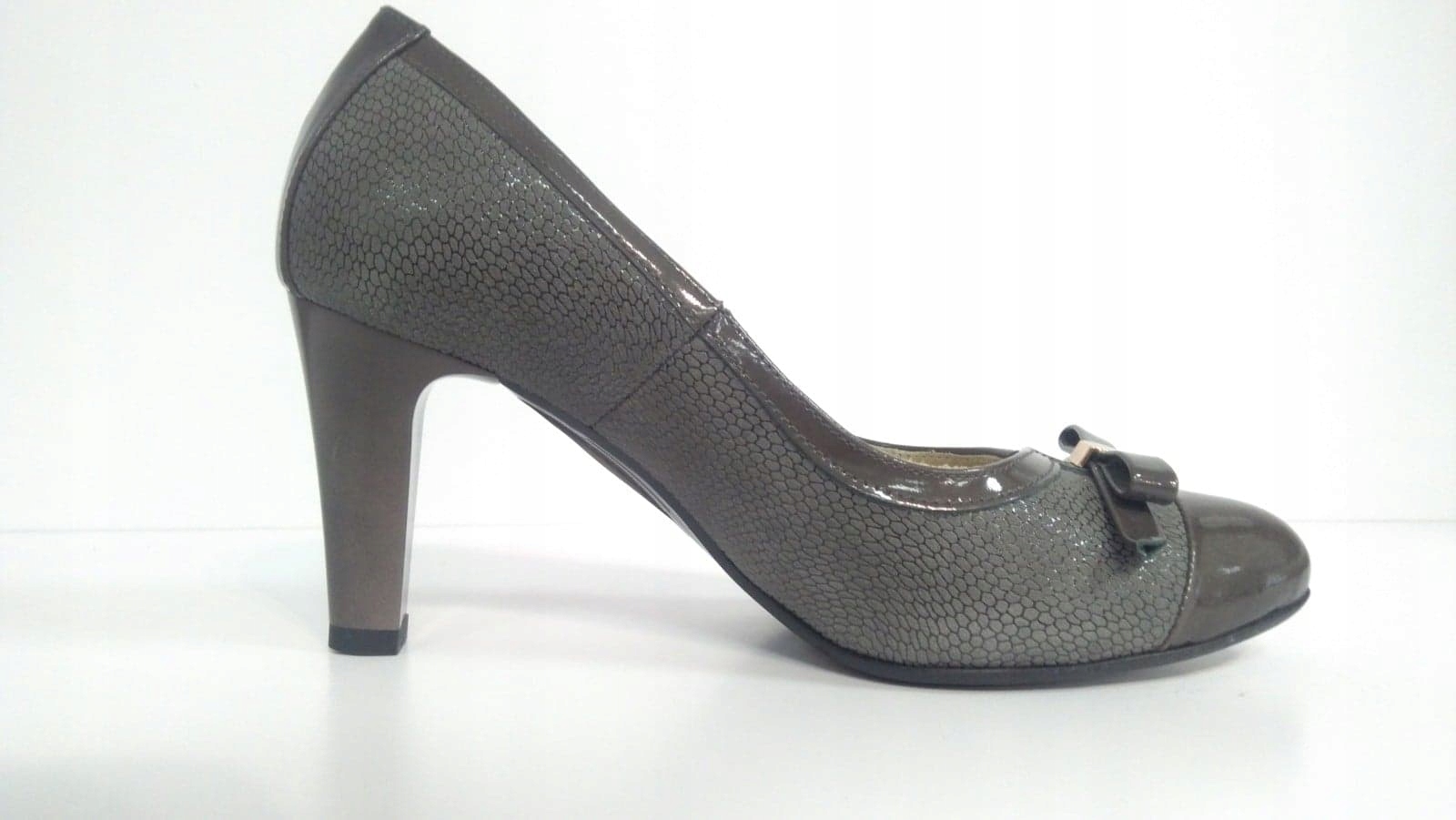 Przedstawiamy panstwu eleganckie czółenka polskiej produkcji EMIS. Wykonane z najlepszej jakości skóry naturalnej.Miękka, skórzana wkładka wewnętrzna gwarantuje komfort.Wygodny obcas o wys. 7,9 cm dodaje szyku i elegancji.Piękne połączenie lakierowanej skóry z łuską tworzy niepowtarzalny charakter.