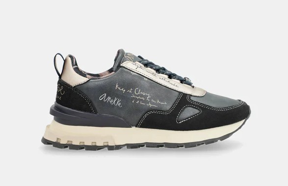 Granatowe sneakersy damskie Anekke Mademoiselle to połączenie elegancji, wygody i artystycznego designu inspirowanego francuskim stylem. Model wyróżnia się niebanalnym zestawieniem kolorów – odcienie beżu, różu i granatu doskonale komponują się z subtelnym nadrukiem, nadając butom wyjątkowego charakteru. Dzięki klasycznemu sznurowaniu obuwie doskonale dopasowuje się do stopy. Na przodzie butów, przez sznurówkę, przepleciony jest srebrny monogram z wizerunkiem kota, który przyciąga wzrok. Miękka wkładka oraz elastyczna, amortyzująca podeszwa zapewniają komfort przez cały dzień – zarówno podczas codziennych spacerów, jak i w podróży.