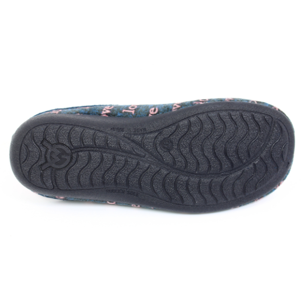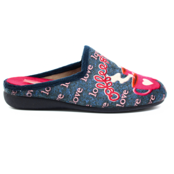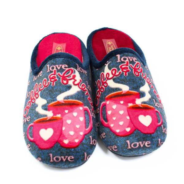 • Wygodne kapcie damskie wykonane z miękkiej tkaniny szewskiej, posiadają kolorowy nadruk. Wyprodukowane w Hiszpanii.