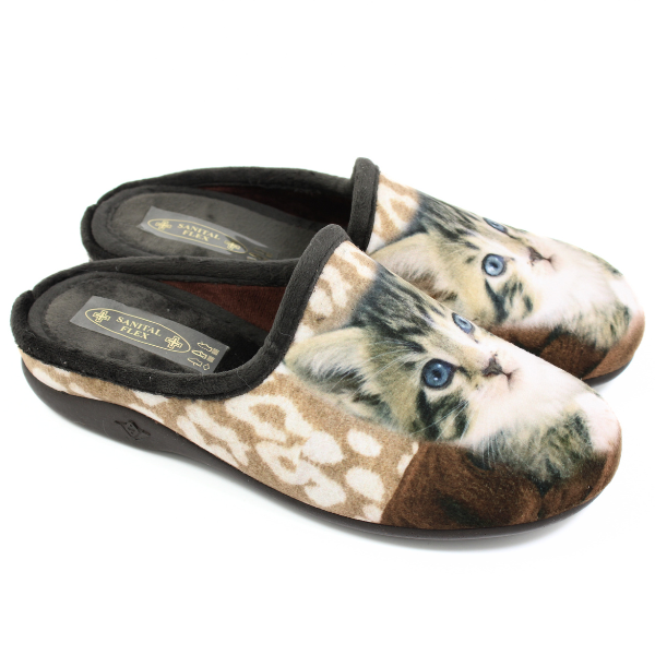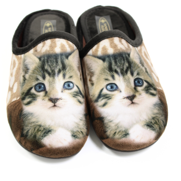- Wygodne kapcie damskie wykonane z miękkiej tkaniny szewskiej, posiadają kolorowy nadruk. Wyprodukowane w Hiszpanii.