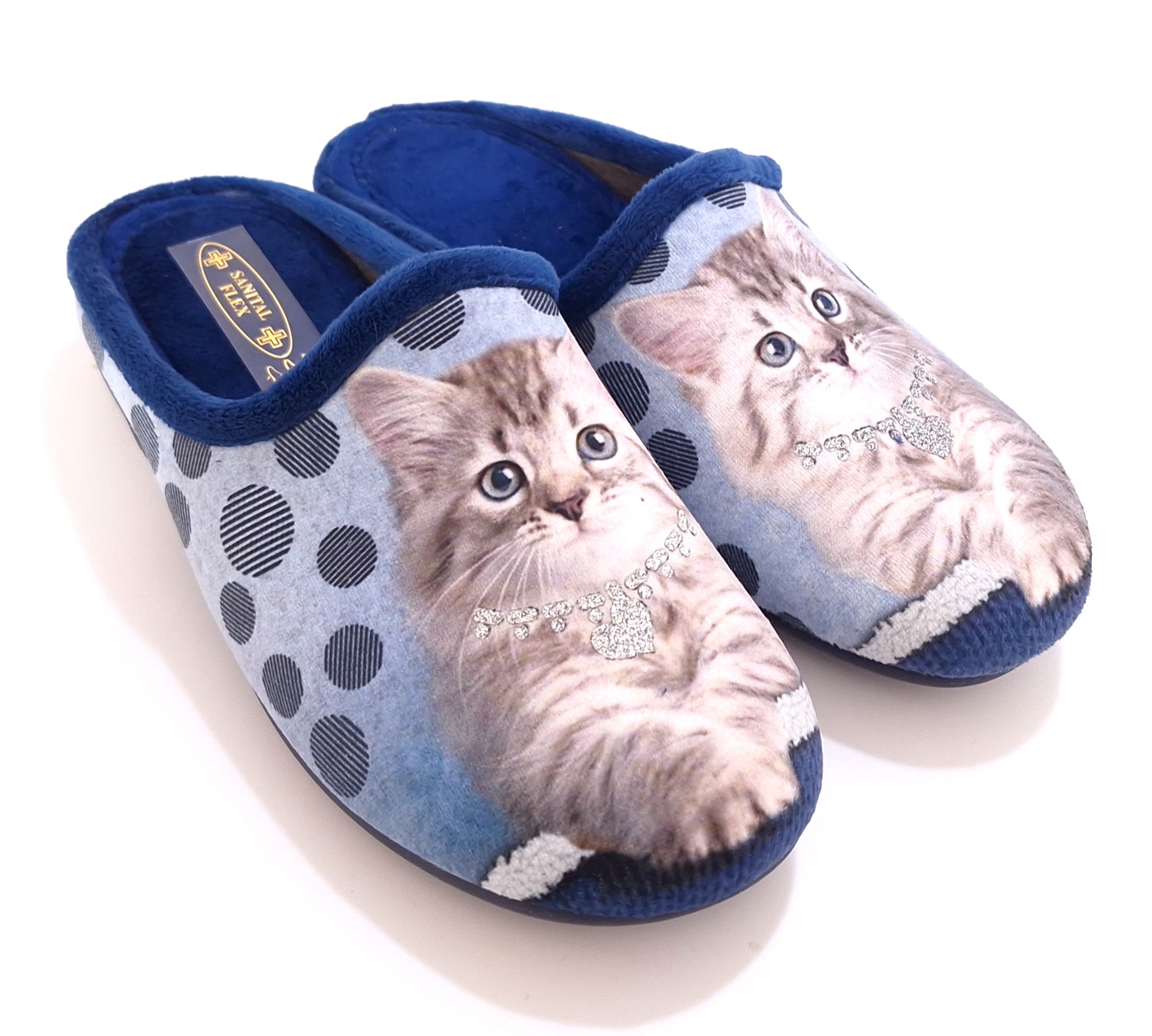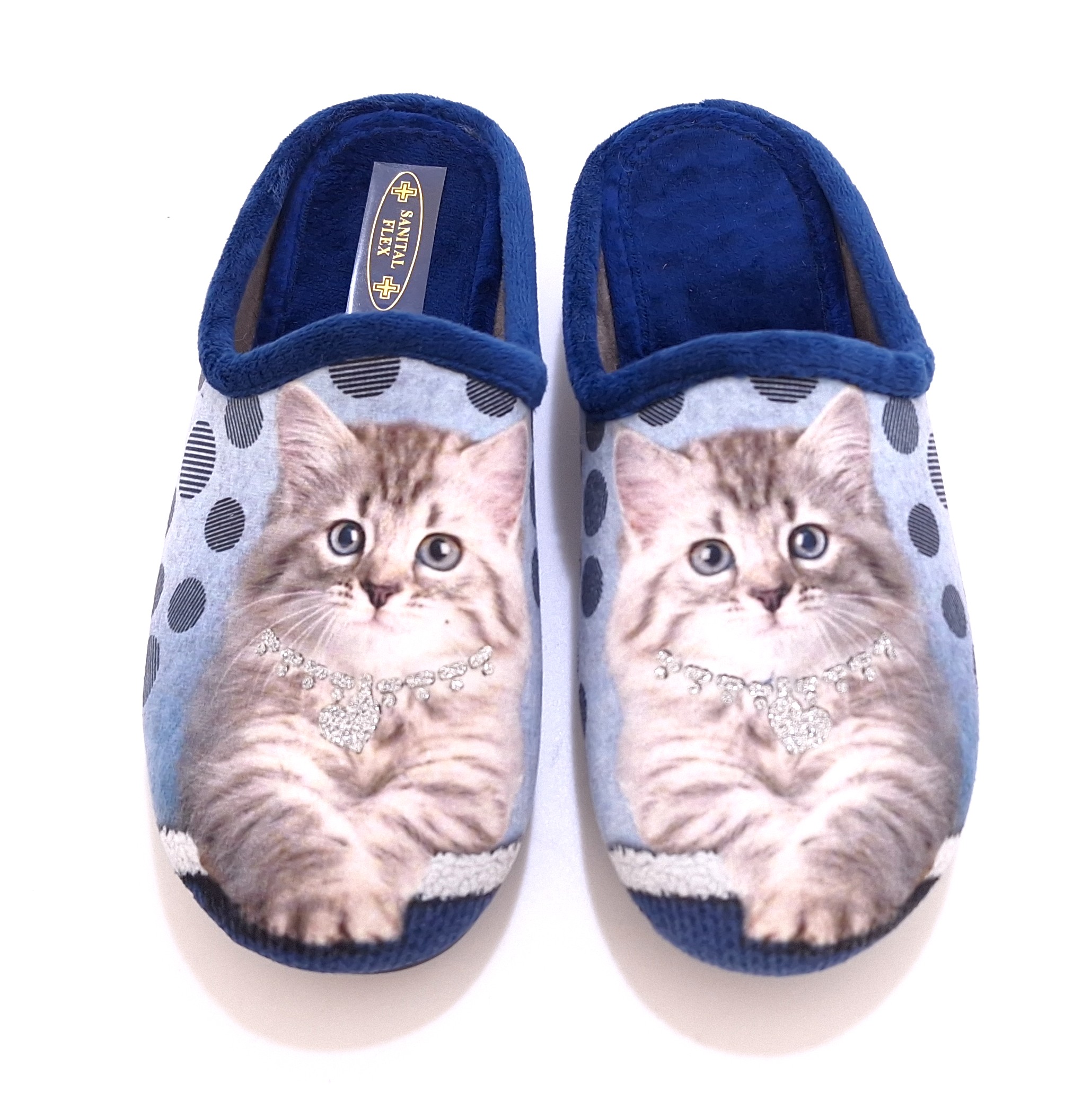 Urocze, miękkie kapcie damskie hiszpańskiej marki Sanital Flex, idealne do codziennego użytku w domu. Wyróżniają się słodkim nadrukiem kotka na niebieskim tle, który nadaje im radosny, przytulny charakter. Idealne dla miłośniczek zwierząt i domowego ciepła!