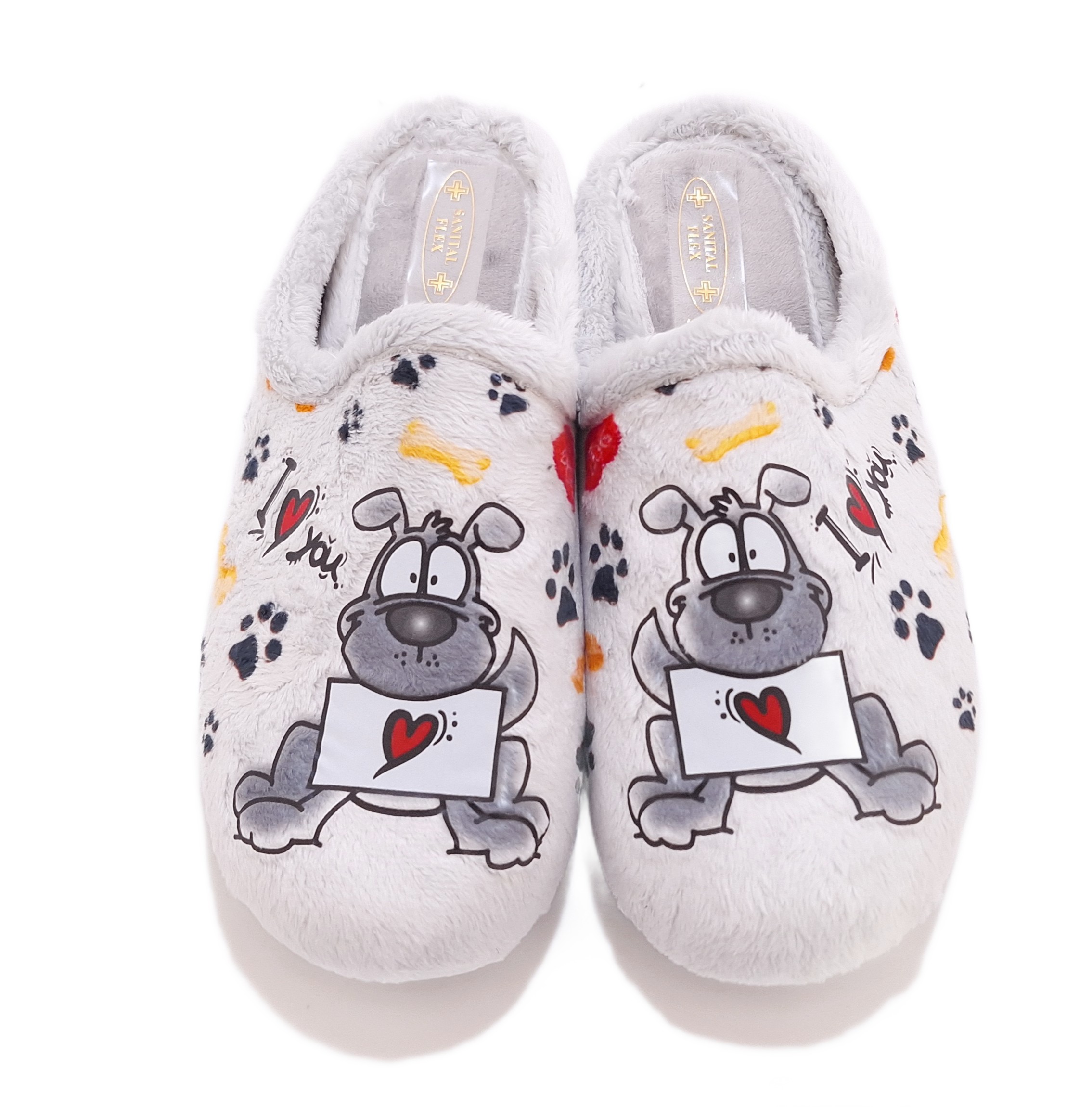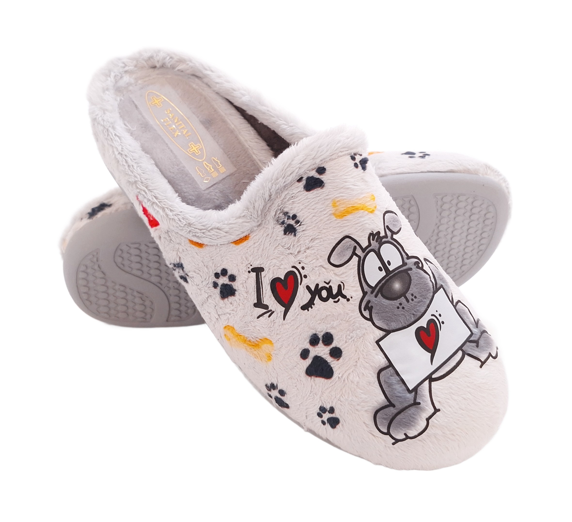 Miękkie i wygodne kapcie damskie włoskiej firmy Sanital Flex w kolorze jasnoszarym, wykonane z przyjemnego w dotyku materiału tekstylnego. Wnętrze wyłożone jest ciepłym, pluszowym futerkiem, które zapewnia komfort i ochronę przed chłodem. Jest wyjątkowo miękka dlatego świetnie amortyzuje, minimalizuje zmęczenie stóp.  Na wierzu kapci znajduje się uroczy nadruk przedstawiający pieska . Idealne dla miłośniczek zwierząt i domowego ciepła!