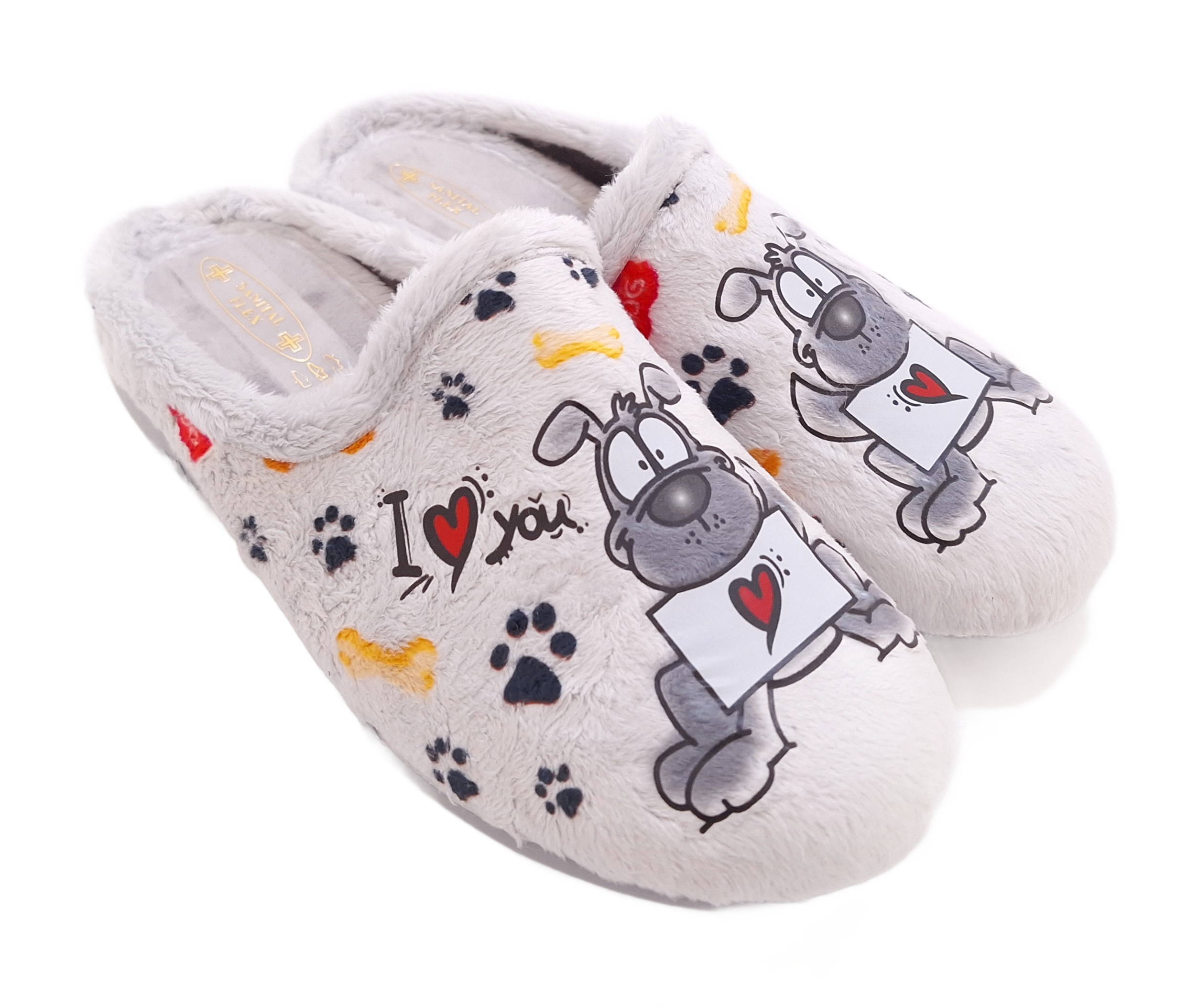 Miękkie i wygodne kapcie damskie włoskiej firmy Sanital Flex w kolorze jasnoszarym, wykonane z przyjemnego w dotyku materiału tekstylnego. Wnętrze wyłożone jest ciepłym, pluszowym futerkiem, które zapewnia komfort i ochronę przed chłodem. Jest wyjątkowo miękka dlatego świetnie amortyzuje, minimalizuje zmęczenie stóp. Na wierzu kapci znajduje się uroczy nadruk przedstawiający pieska . Idealne dla miłośniczek zwierząt i domowego ciepła!
