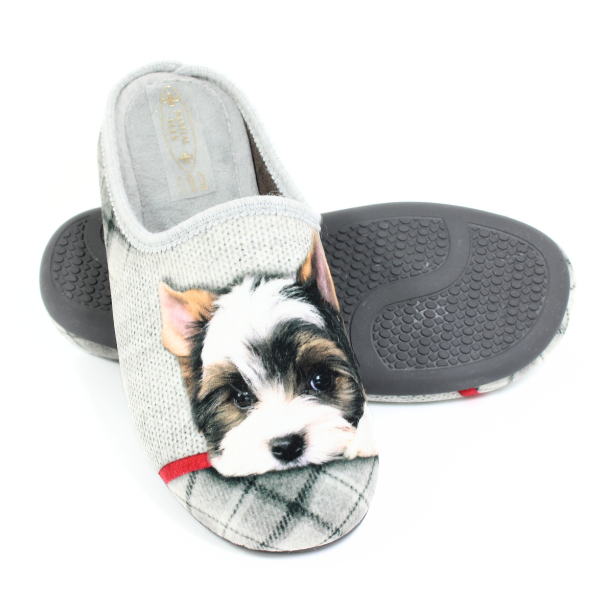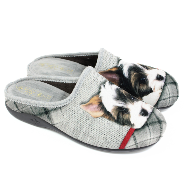 Ten model kapci wyróżnia uroczy nadruk yorka na tle wzoru tkaniny dzianinowej. Co nadaje temu modelowi ciepłego i relaksującego charakteru.