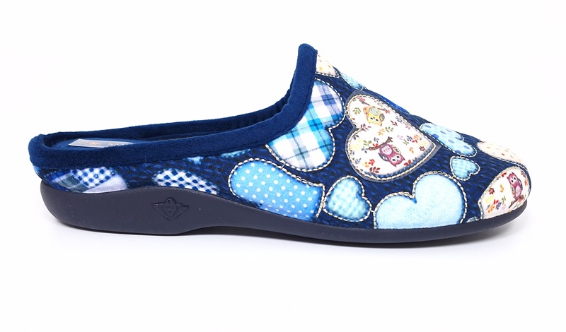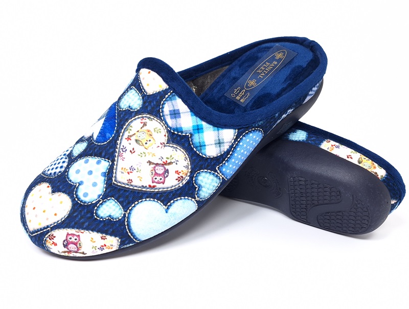- Wygodne kapcie damskie wykonane z miękkiej tkaniny szewskiej, posiadają kolorowy nadruk w postaci różnej wielkości serduszek. Wyprodukowane w Hiszpanii.