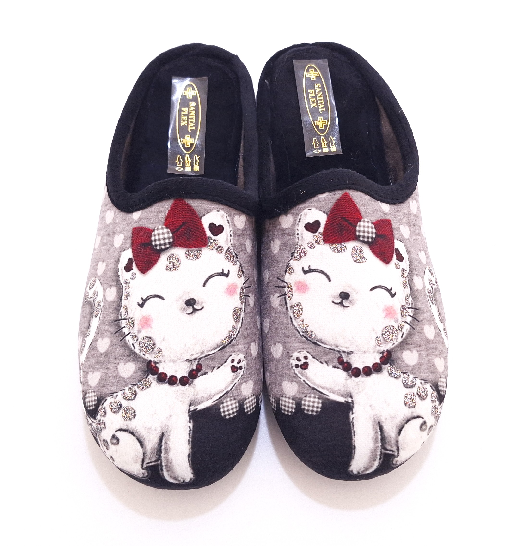 Urocze damskie kapcie domowe hiszpańskiej marki Sanital Flex to idealne połączenie stylu i komfortu. Model ozdobiony jest motywem białego kotka z czerwonym kokardką i błyszczącymi, srebrnymi brokatowymi wstawkami, które dodają im wyjątkowego uroku.
