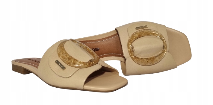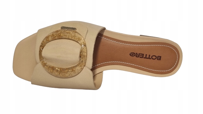 Klapki beżowe renomowanej firmy BOTTERO z ozdobą. Zostały wykonane ze skóry naturalnej. Klapki są na płaskim obcasie na 1,8 cm obcasie.