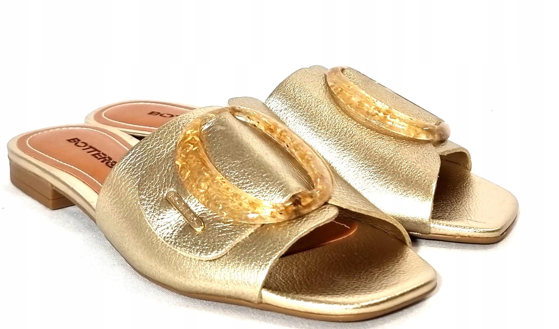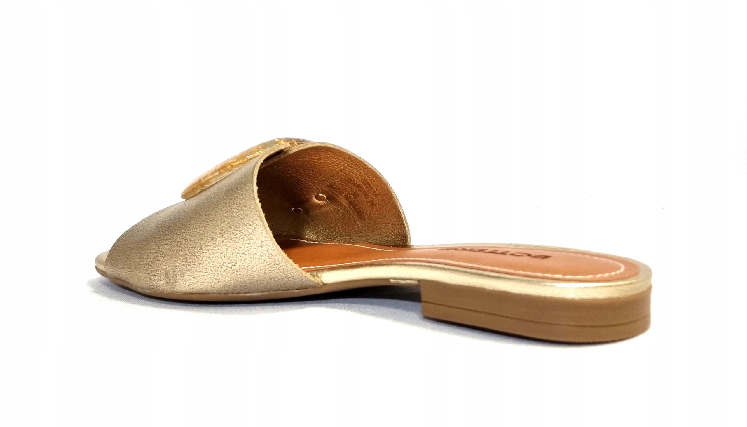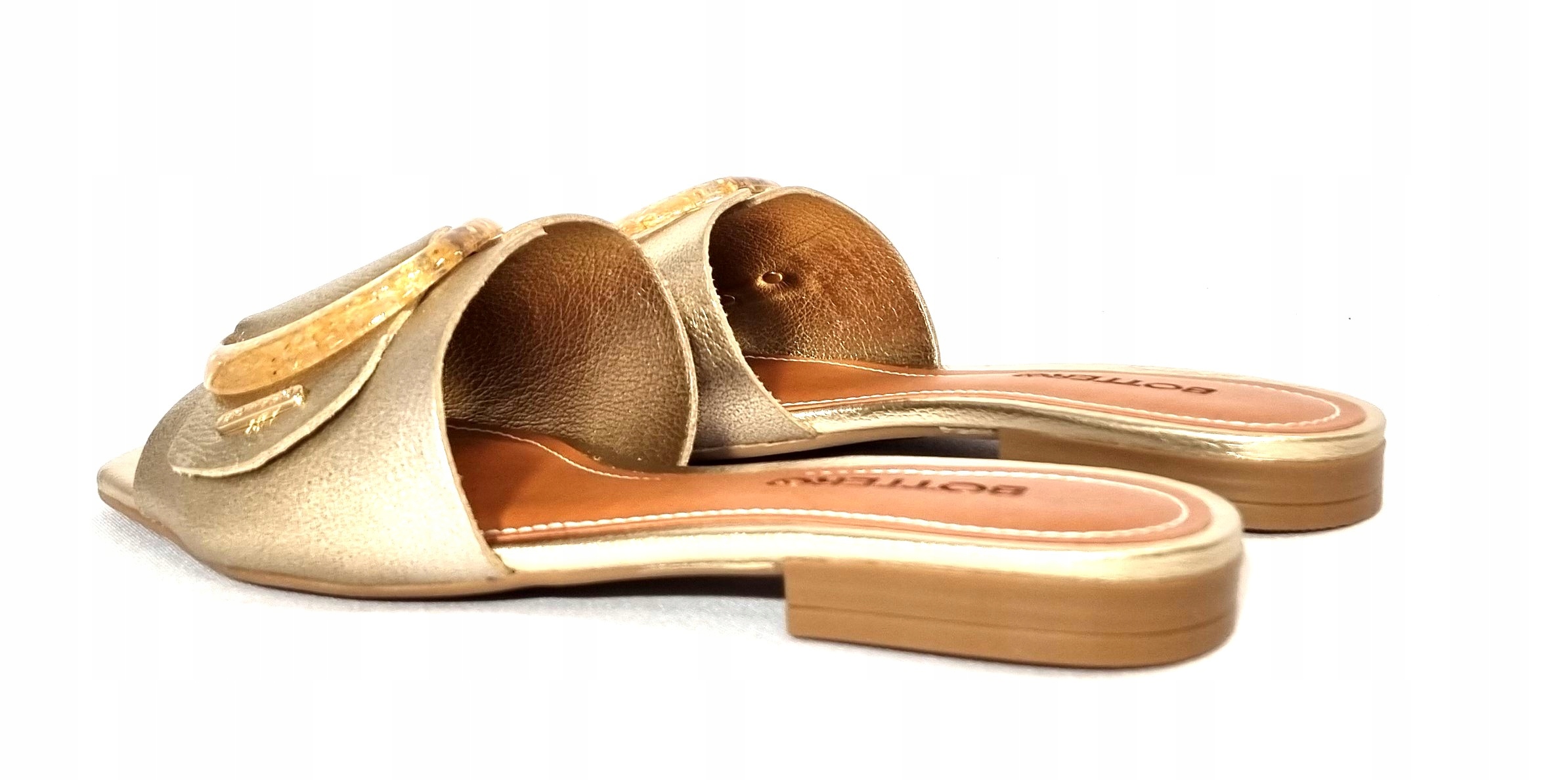 Klapki w kolorze złotym renomowanej firmy BOTTERO z ozdobą. Zostały wykonane ze skóry naturalnej. Klapki są na płaskim 1,8 cm obcasie.