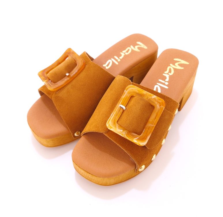 • Klapki damskie drewniaki z klamrą , wykonane ze skóry zamszowej w brązowym kolorze. Osadzone na szerokim obcasie.