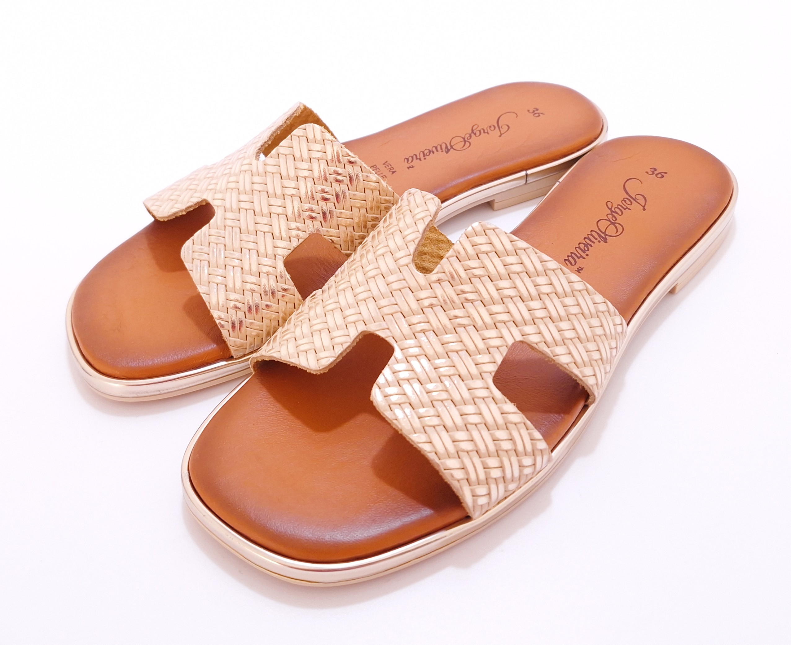Złot- beżowe klapki damskie marki Jorge Oliveira wykonane z naturalnej skóry. Cholewka w kształcie litery H o plecionym wzorze, który dodaje całości subtelnego charakteru i wyjątkowego stylu. Klapki charakteryzują się płaskim obcasem, któryzapewnia stabilność i komfort noszenia.Dzięki klasycznemu, a jednocześnie oryginalnemu designowi, klapki świetnie uzupełnią zarówno casualowe, jak i bardziej eleganckie stylizacje – od jeansów, przez lniane spodnie, po letnie sukienki.