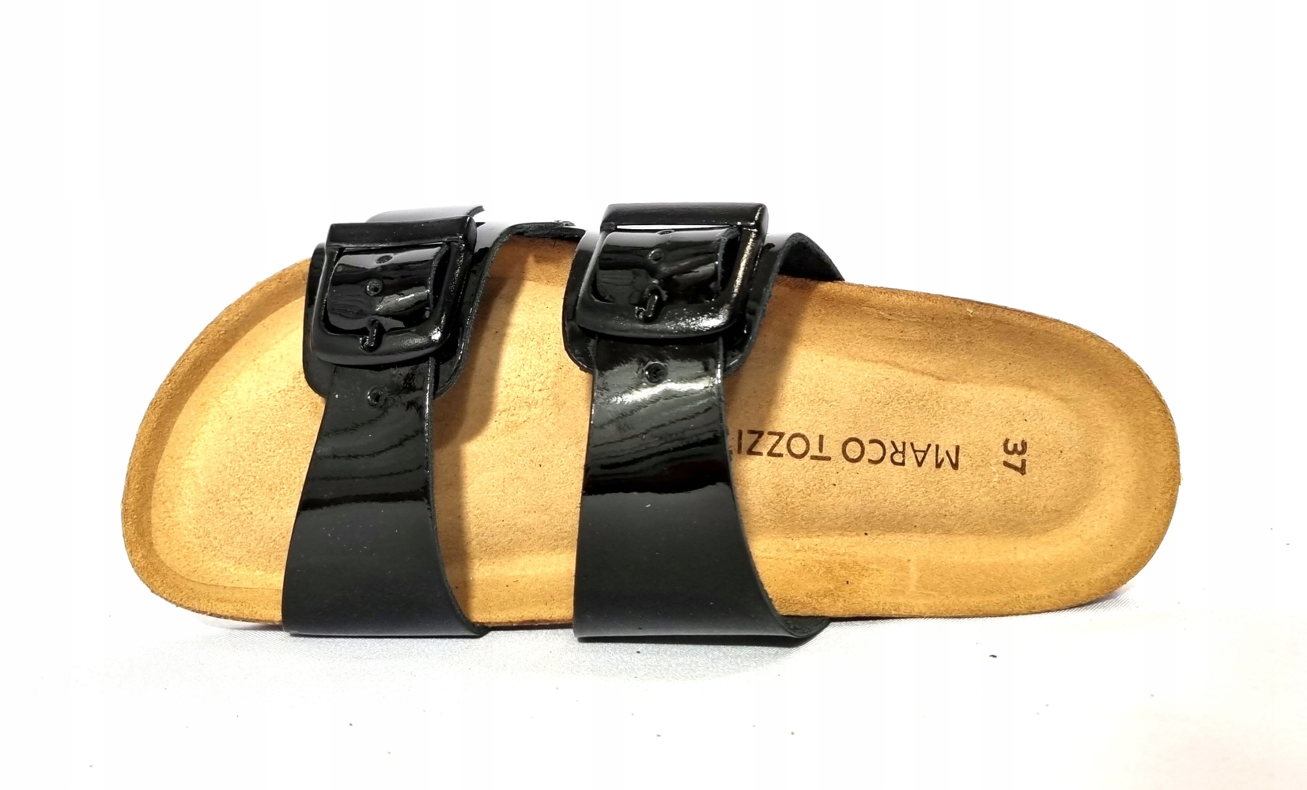 Producent renomowanej marki Marco Tozzi proponuje klapki w odcieniu czarnym. Klapki zostały wykonane ze skóry naturalnej. Wkładka również została wykonana ze skóry naturalnej. Wysokość podeszwy wynosi 2,5 cm. Podeszwa wykonana z trwałego tworzywa, odpornego na ścieranie, z właściwościami antypoślizgowymi.
