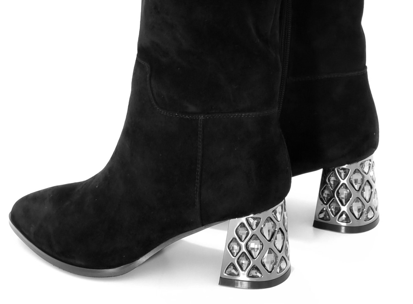 - Eleganckie kozaki damskie, wykonane ze skóry zamszowej, ocieplone wewnątrz futrzanym kocem obuwniczym. Długie kozaki skórzane ozdobione cyrkoniami na obcasie oraz okazałym suwakiem w górnej części cholewki, ułatwiającym dopasowanie wysokości buta.
