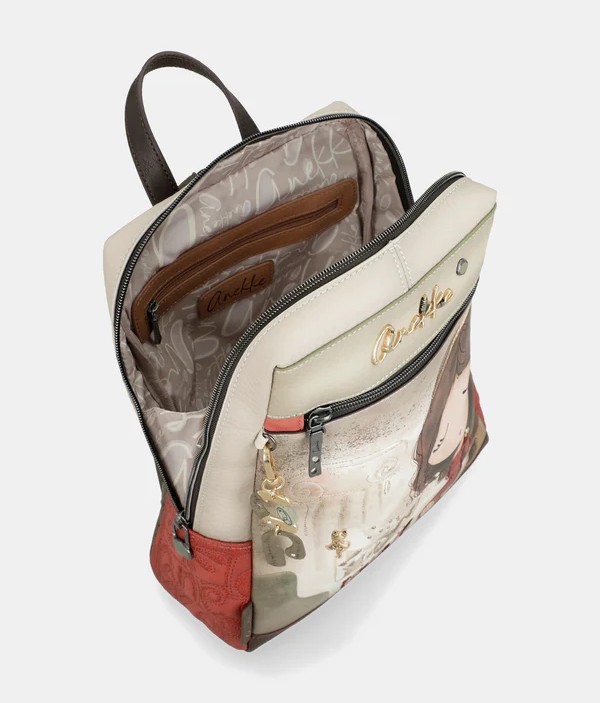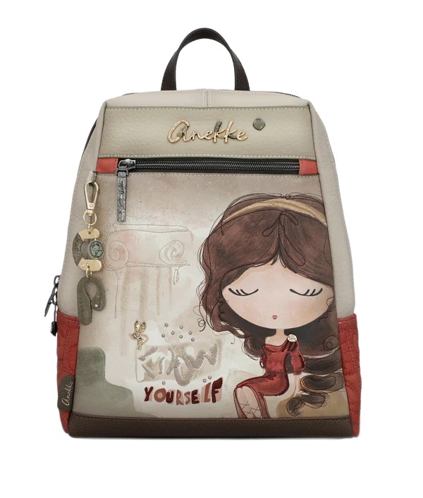 Miejski plecak damski o kwadratowym kształcie Anekke Muse SS26, wykonany z ekologicznej skóry. Front plecaka zdobi grafika przedstawiająca Anekke w otoczeniu greckich kolumn. Model wyposażony w jedną komorę główną zamykaną na dwukierunkowy zamek błyskawiczny. Wnętrze wyłożone kolorową podszewką, zawiera jedną kieszonkę na suwak i dwie otwarte. Z tyłu oraz z przodu znajdują się dodatkowe kieszonki zapinane na suwak. Plecak Anekke posiada uchwyt i dwa regulowane paski.