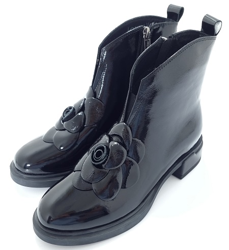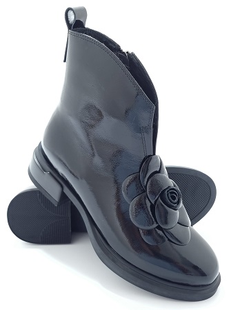 - Eleganckie, lakierowane damskie botki z ozdobnym kwiatem marki Loretta Vitale. Wykonane z naturalnej skóry lakierowanej. Model lekko ocieplany.