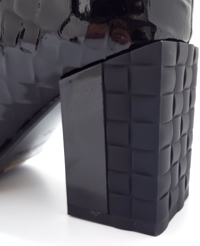 • Eleganckie botki na obcasie. Wykonane z naturalnej skóry lakierowanej z delikatnym wzorem. Model na designerskim obcasie, lekko ocieplany.
