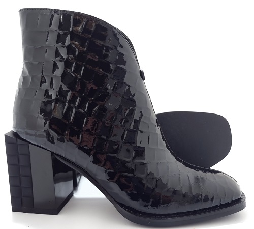 - Eleganckie botki na obcasie. Wykonane z naturalnej skóry lakierowanej z delikatnym wzorem. Model na designerskim obcasie, lekko ocieplany.