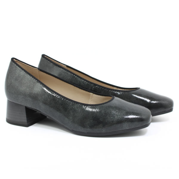 - Szare czółenka na niskim obcasie wykonane z lakierowanej skóry. Obuwie posiada poszerzoną tęgość H.