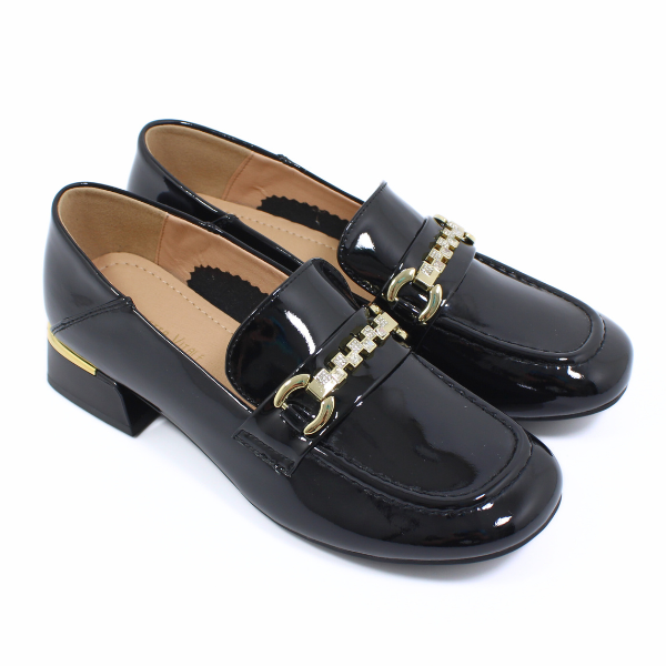 - Damskie lakierowane półbuty typu mokasyny na niewysokim obcasie z dekoracyjnym łańcuszkiem.