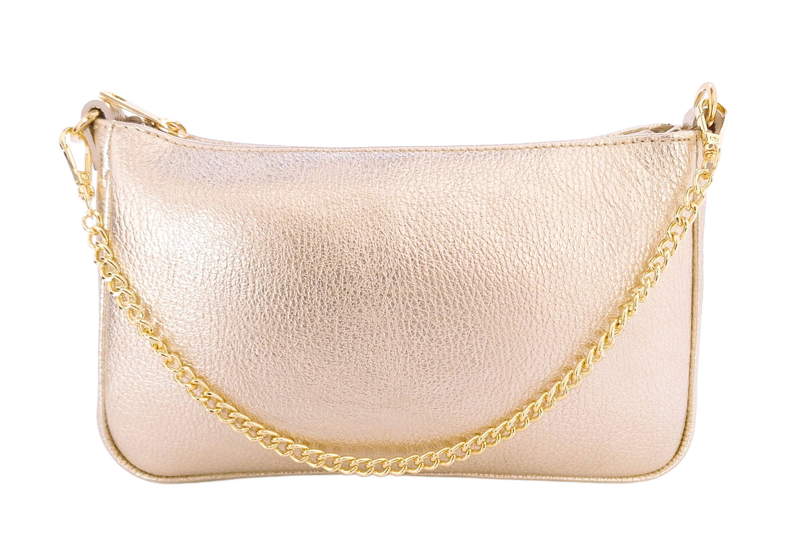 - Złota skórzana kopertówka na łańcuszku. Idealna na wesela, czy inne eleganckie okoliczności.