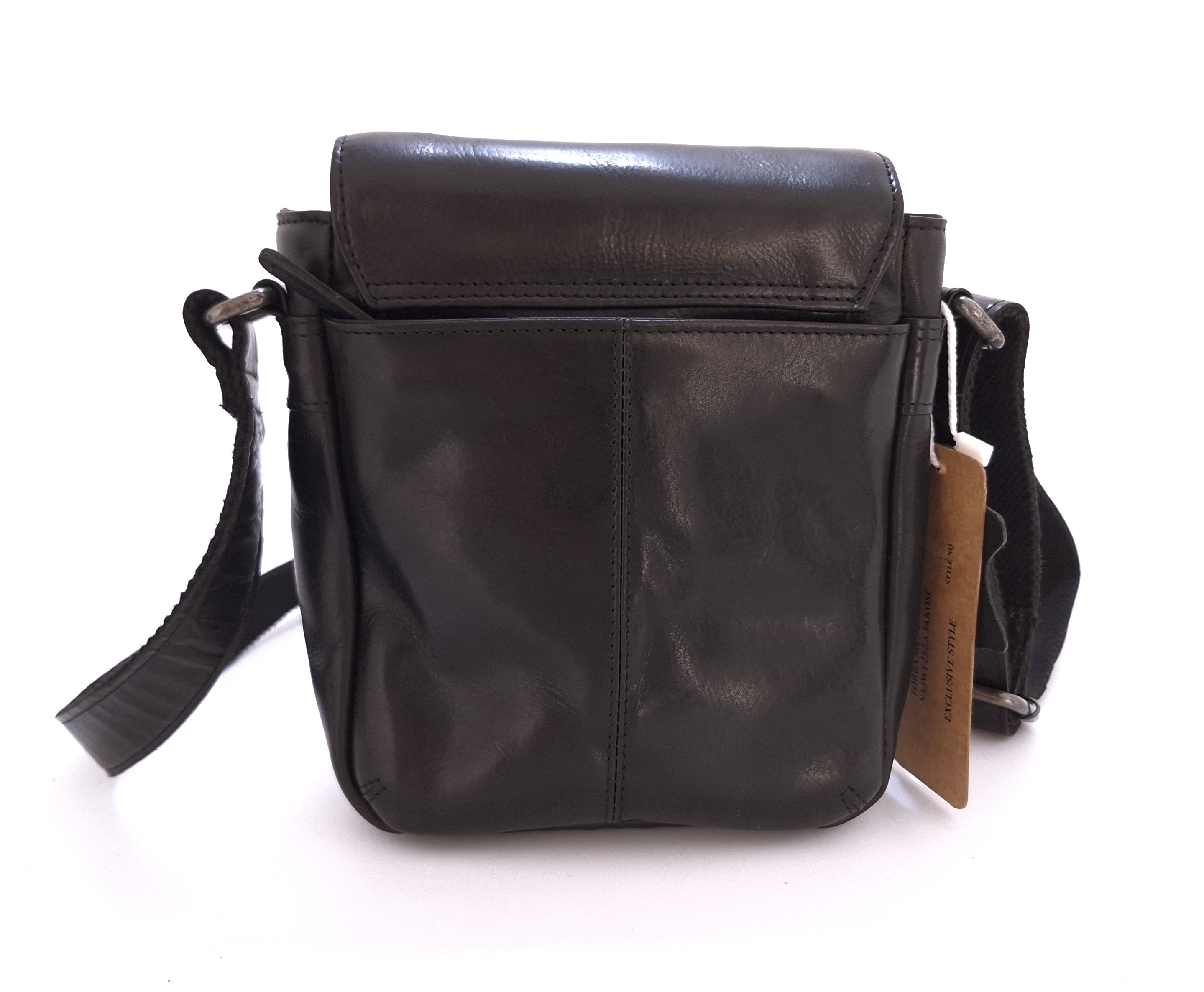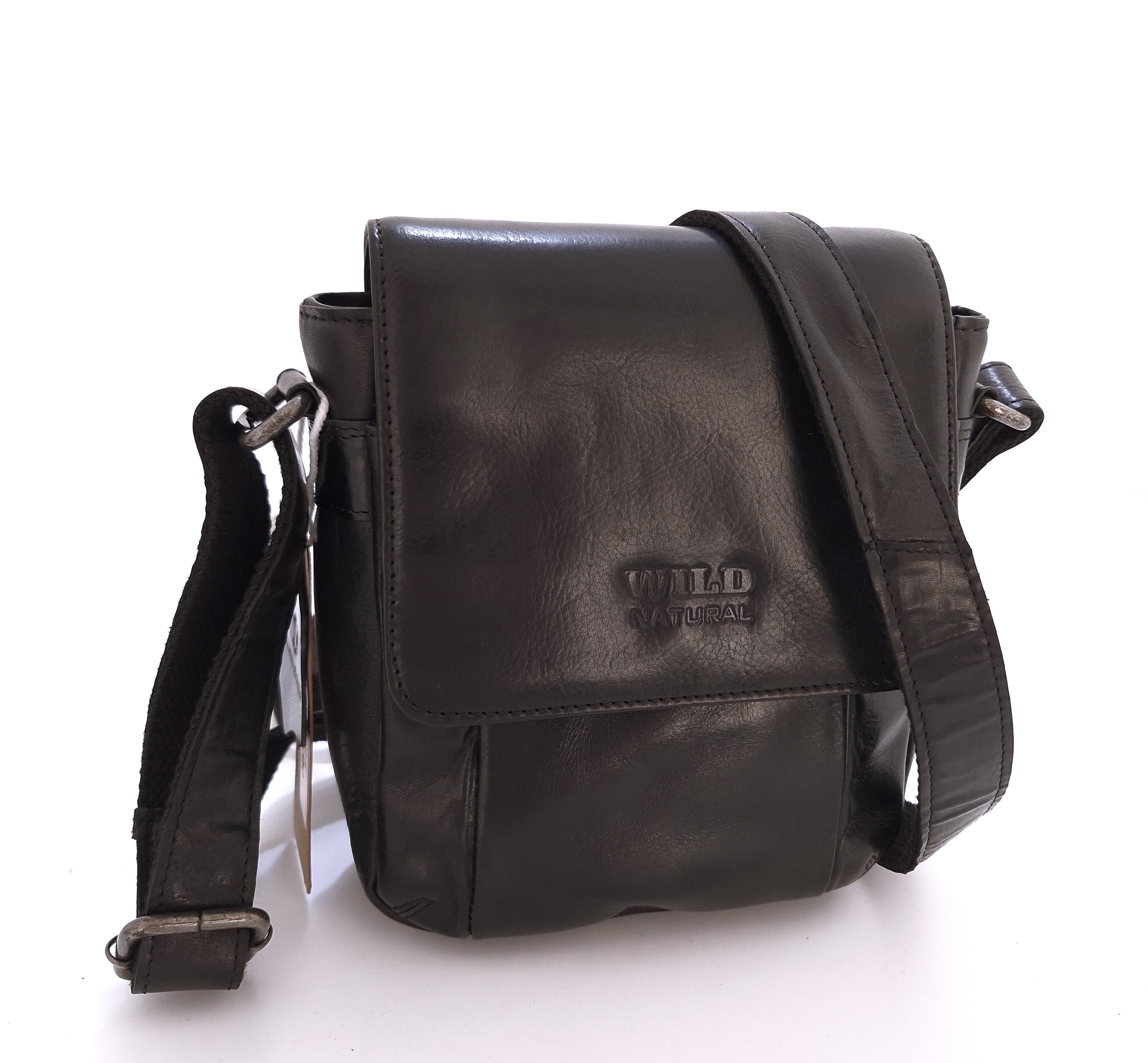 Mała, czarna męska torba na ramię marki Wild Natural wykonana z naturalnej skóry o gładkim licu. Główna komora zamykana jest na zamek, dodatkowo zabezpieczona klapką z magnetycznym zapięciem. Pod klapą i z tyłu znajdują się kieszonki: 1 kieszeń zamykana na zatrzask, zaś druga na suwak. Listonoszkę można wygodnie nosić na ramieniu dzięki szerokiemu, bawełnianemu paskowi, wzmocnionemu skórzanym wykończeniem.