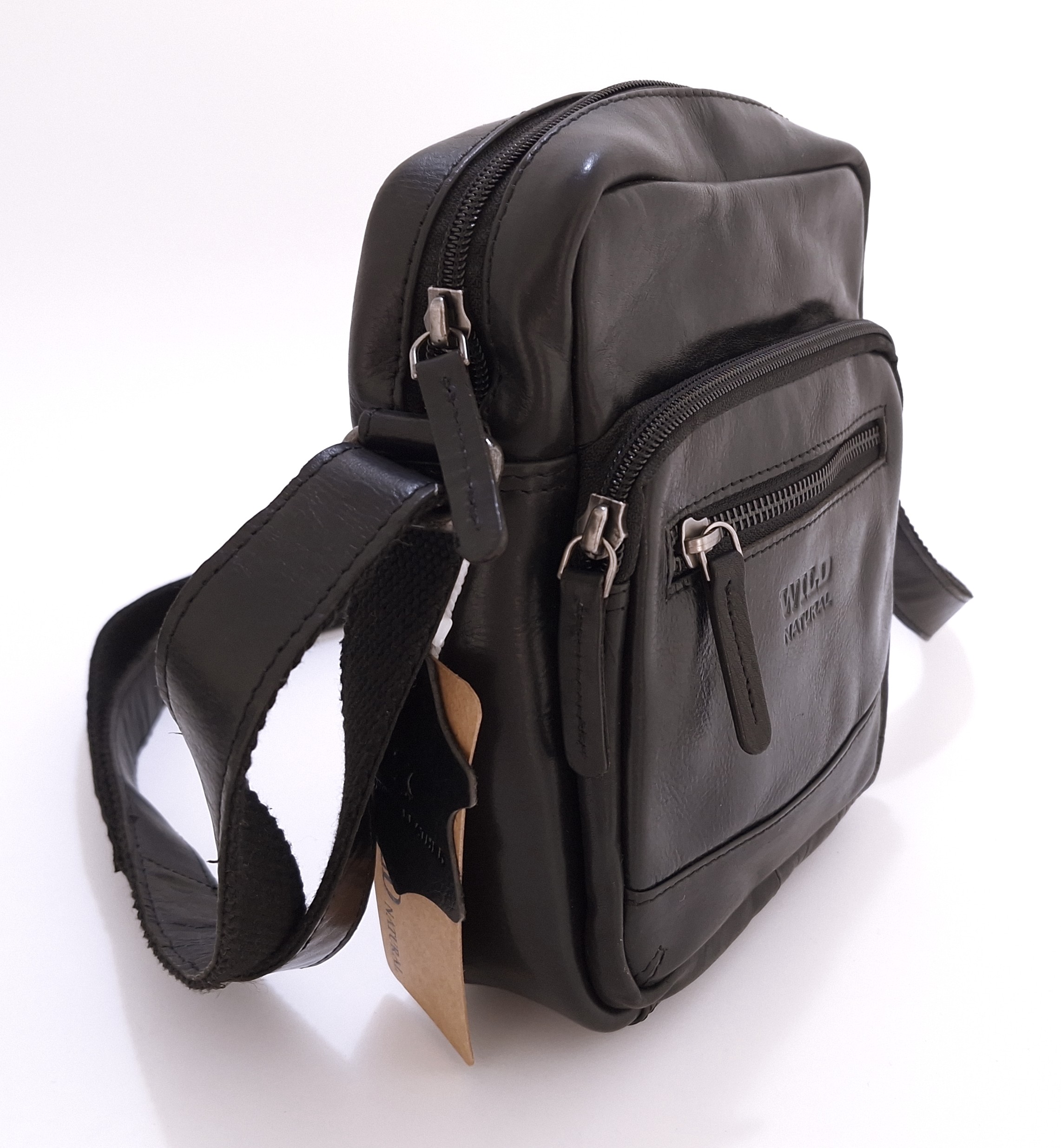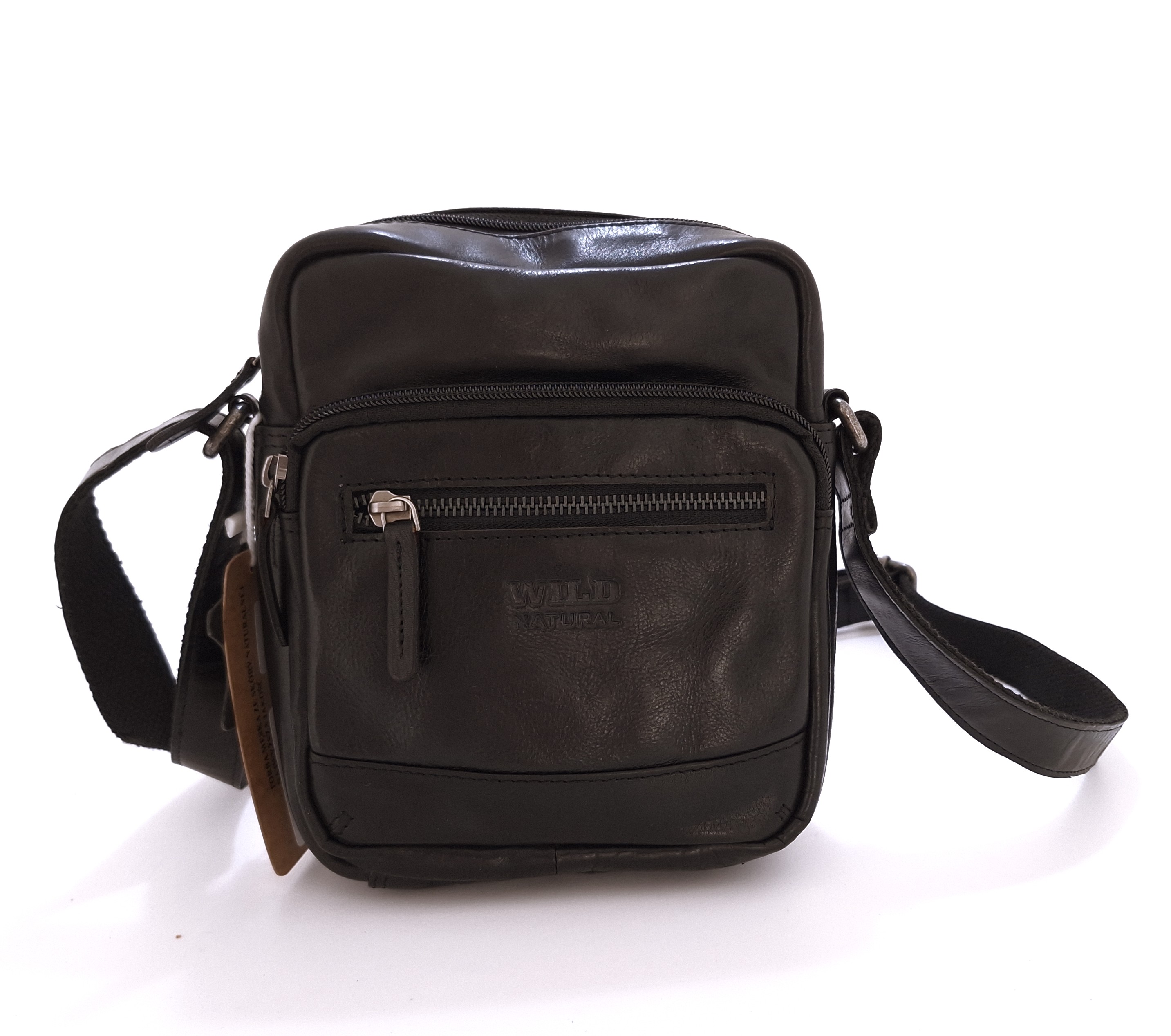 Małej wielkości torba męska crossbody marki Wild Natural wykonana z naturalnej skóry w czarnym kolorze. Regulowany pasek na ramię pozwala nosić torbę na kilka sposobów. Listonoszka posiada jedną główną komorę zamykaną na zamek błyskawiczny. Posiada frontową kieszeń zamykaną na suwak. Z tyłu także znajduje sie kieszonka na suwak.
