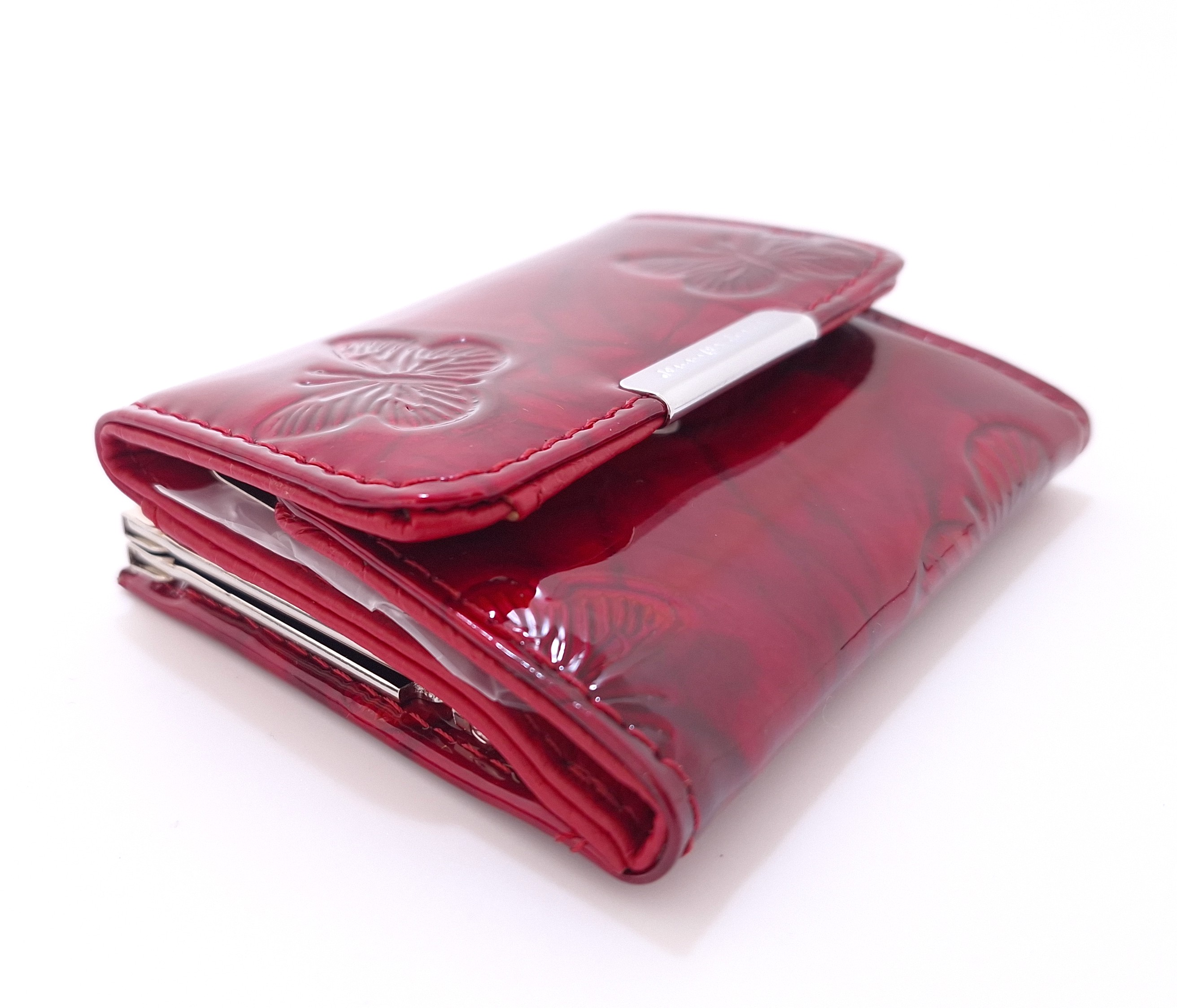 - Elegancki portfelik damski z lakierowanej skóry w czerwonym kolorze. Kompaktowy rozmiar sprawia, że zmieści się w każdej damskiej torebce. Całość zamykana na zatrzask i bigiel.