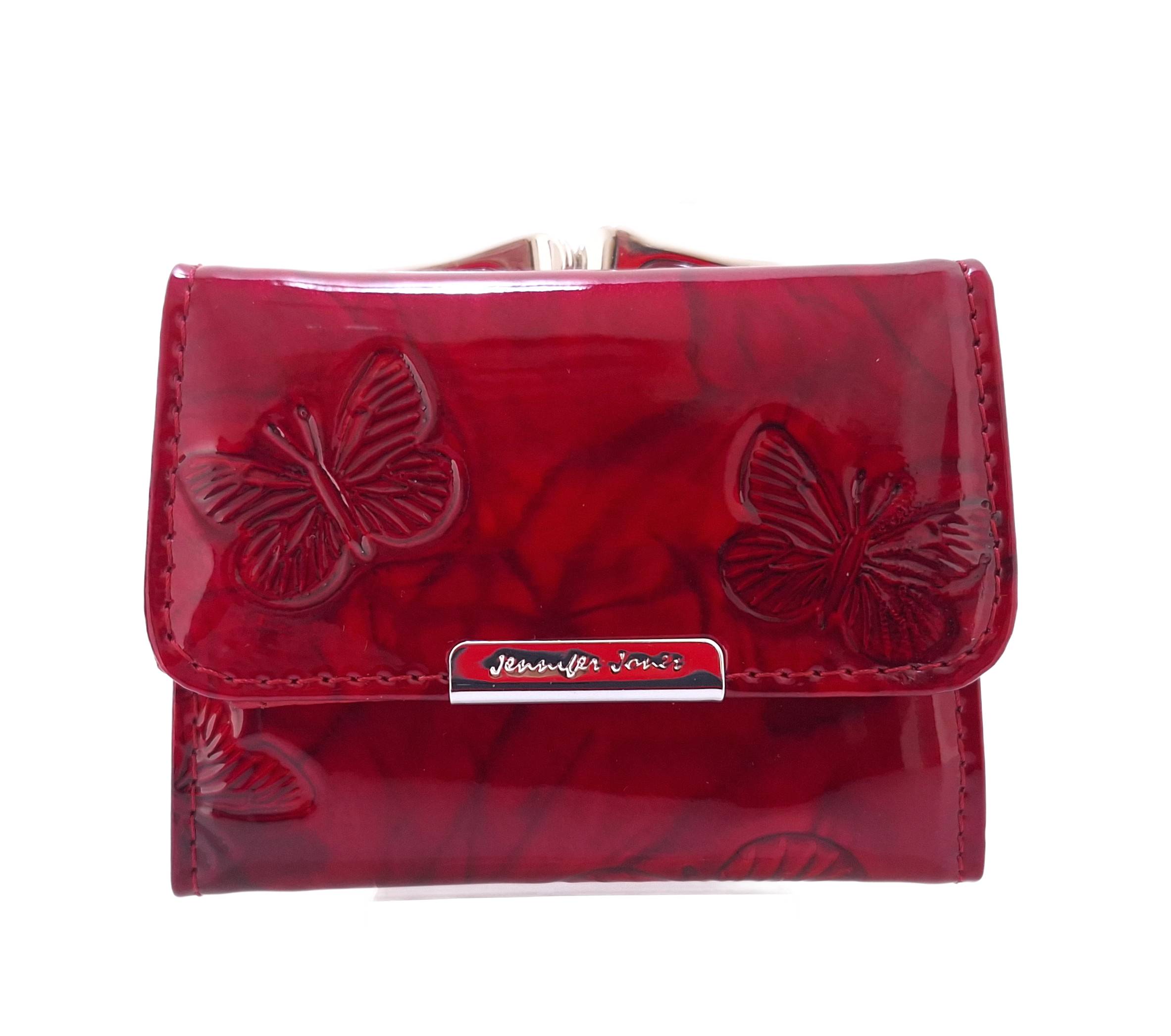 Czerwony portfel damski o fasonie pormonetki marki Jennifer Jones ozdobiony w motyli wzór. Model z klapką wykonany z lakierowanej skóry. Kompaktowy rozmiar sprawia, że idealnie mieści się w każdej damskiej torebce. Mimo niewielkich wymiarów, portfel oferuje praktyczne wnętrze, które pomieści wszystkie najważniejsze rzeczy – od monet, przez banknoty. Portmonetka dzieli się na dwie części: część na bilon zamykana jest na wygodną klamrę, zaś druga na nap.
