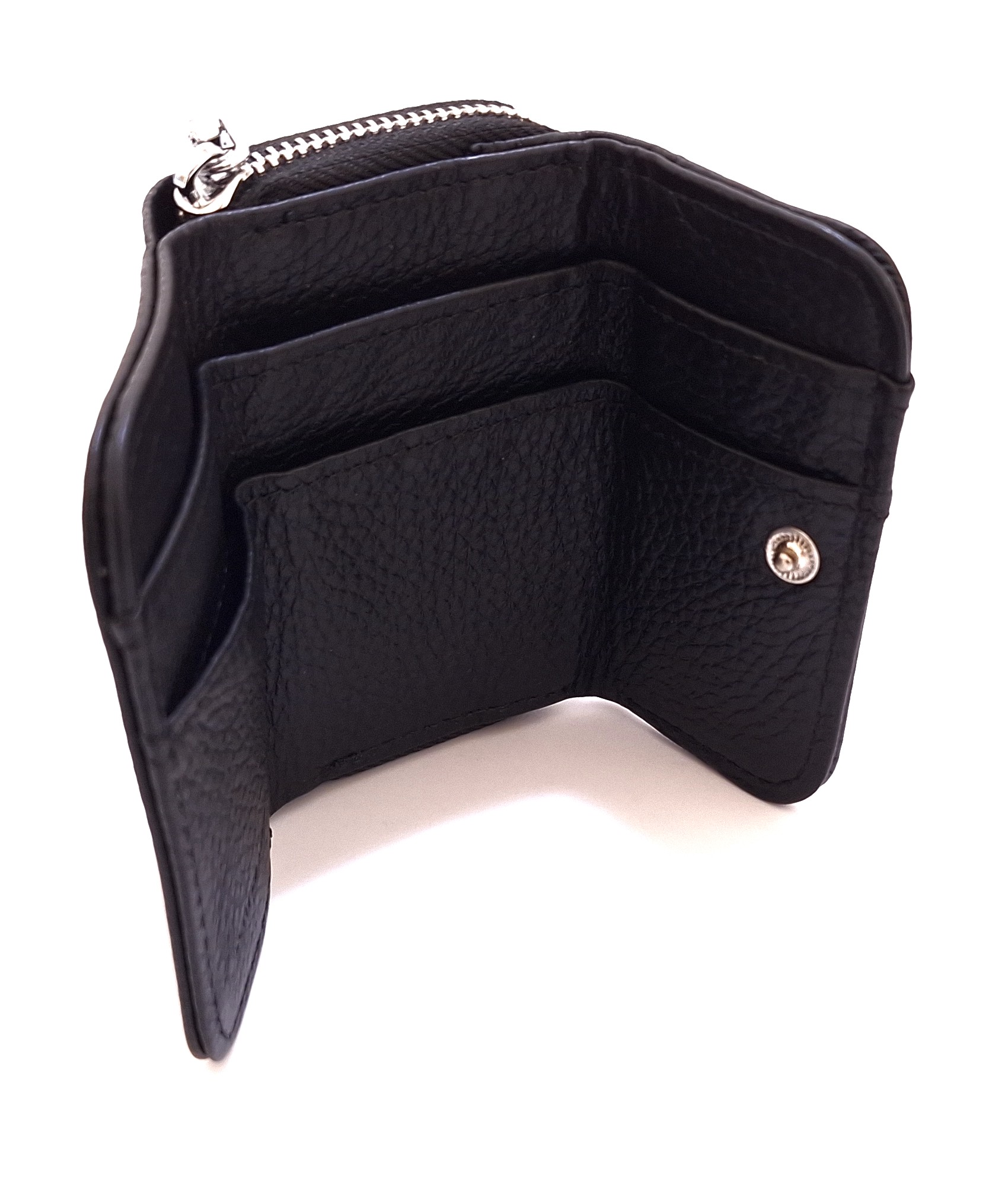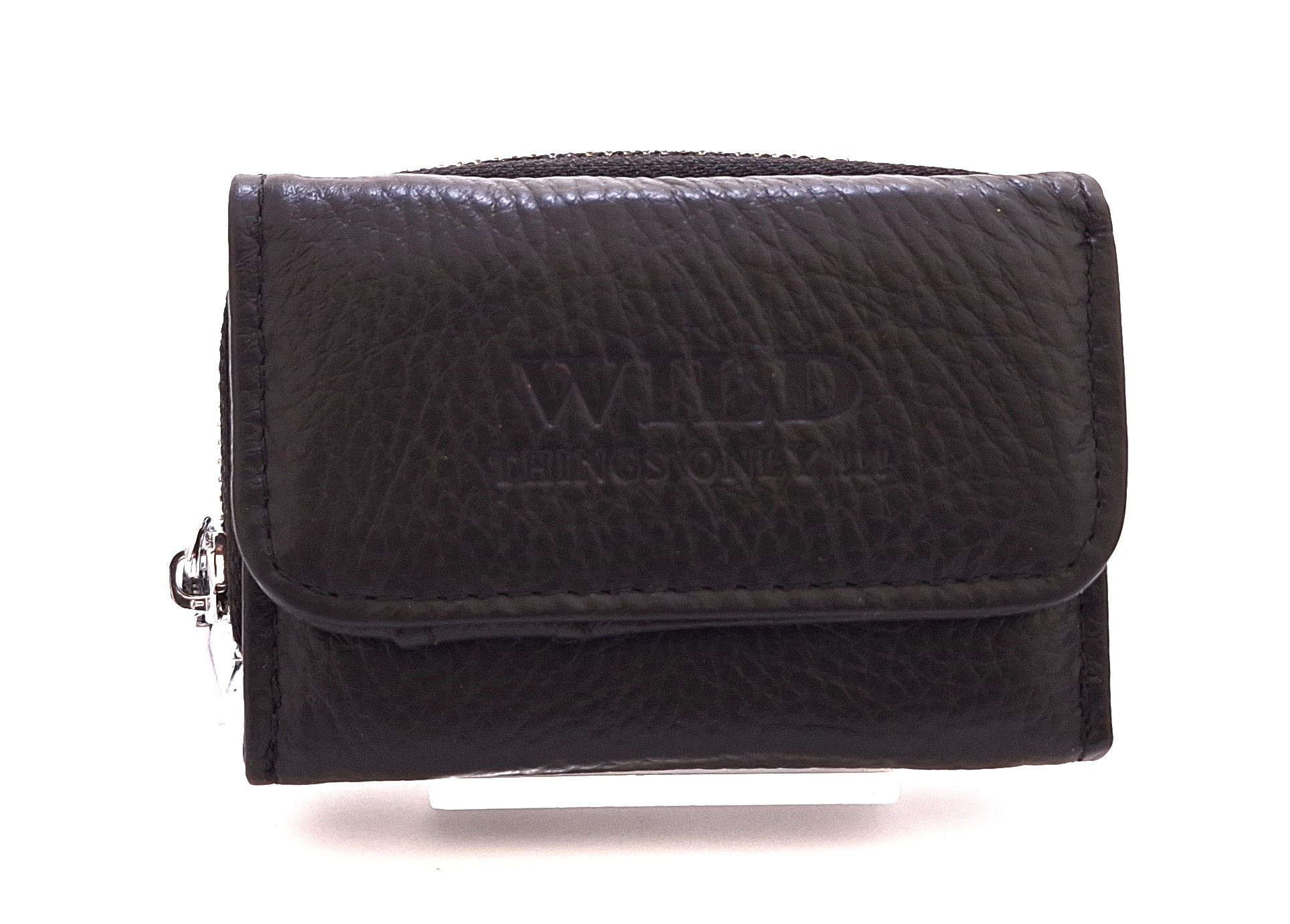 Mały portfel męski marki WILD uszyty z wysokogatunkowej skóry naturalnej w czarnym kolorze. Portfel składa się z dwóch sekcji. Pierwsza zamykana na zatrzask mieści 2 przegrody na banknoty o wielkości karty kredytowej, zaś druga zamykana na zamek błyskawiczny do przechowywania drobnych monet. Model o orientacji poziomej zmieści się w każdej kieszeni marynarki, czy spodni.