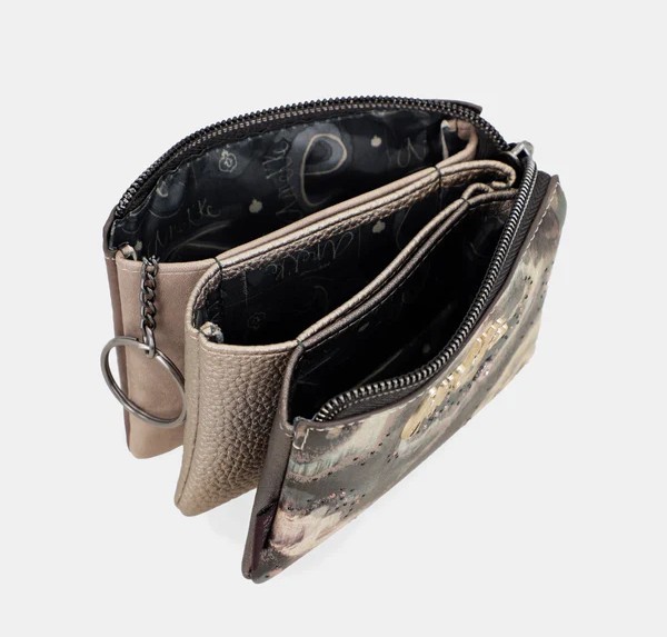 Mała portmonetka Anekke Real z linii Manifesto, wykonany z ekologicznej skóry. Portmonetka posiada trzy osobne komory zamykane na zamek błyskawiczny. Jedna komora posiada łańcuszek z kółkiem na które można nałożyć klucze. Pozostałe dwie komory moga służyć do przechowywania banknotów i karty płatniczej. Wnętrze wykończone podszewką z kolekcji. Z tyłu znajduje się kieszonka na suwak, idealna na bilon.