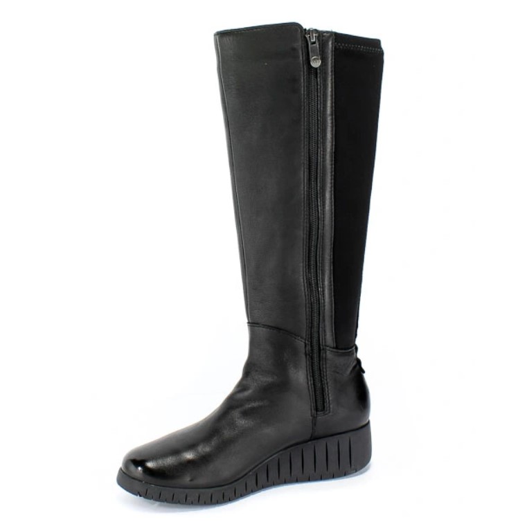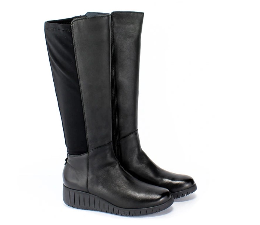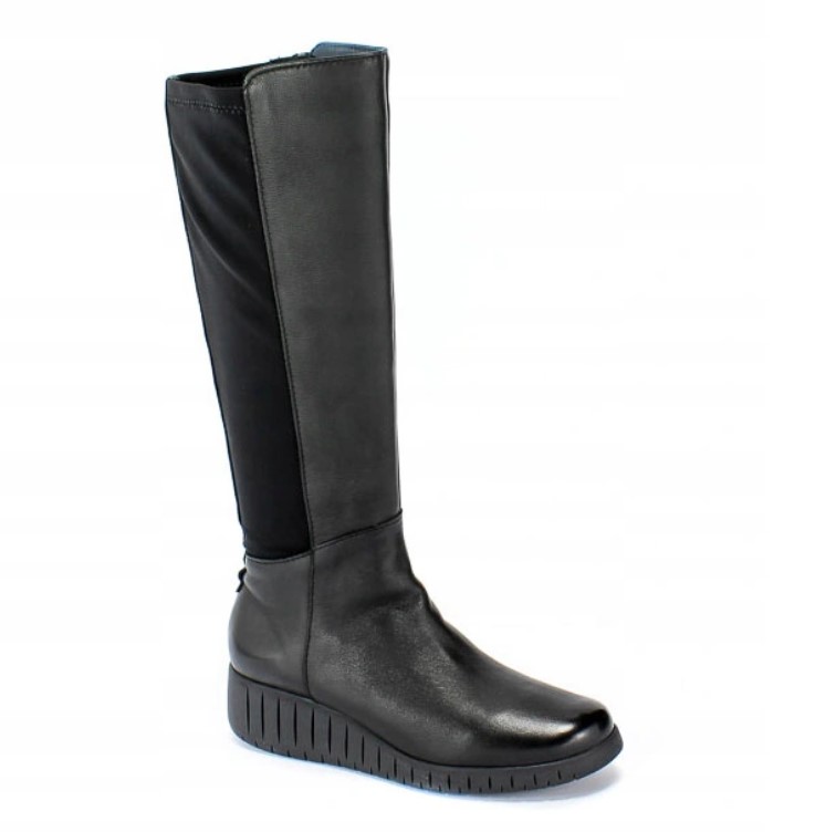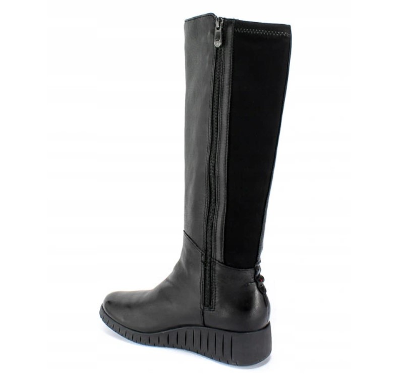 Z tyłu cholewka wykonana jest z materiału stretch- (uciągającego się) w kolorze czarnym, który dostosowuje się także na szersze łydki.