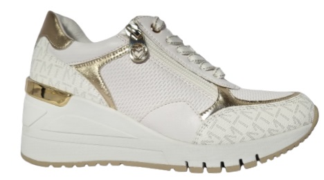 - Białe sneakersy na koturnie, wykonane z wysokiej jakości materiału syntetycznego w połączeniu ze złotymi wstawkami. Posiada ozdobny suwak ułatwiający zakładanie.