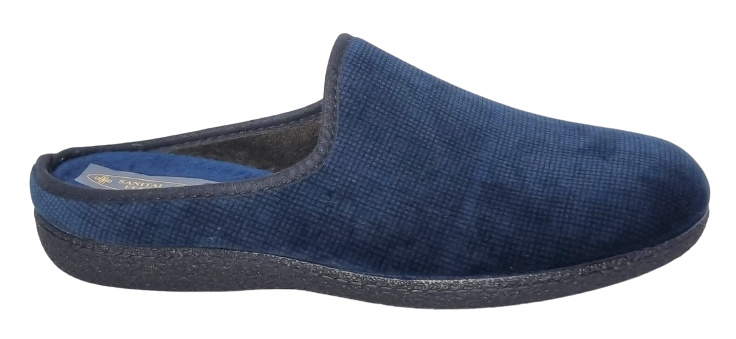 - Męskie kapcie w kolorze granatowym, wykonane z miękkiej tkaniny welurowej.
