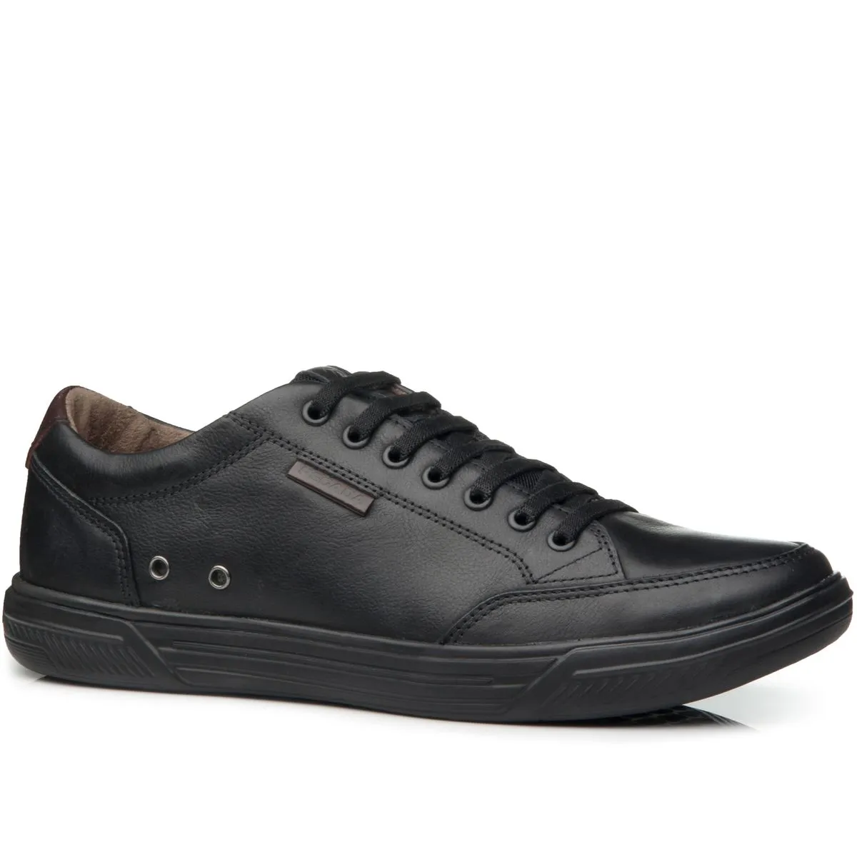 - Casualowe męskie półbuty o fasonie trampek na lekkiej i elastycznej podeszwie. Wykonane z naturalnej skóry w kolorze czarnym. Elastyczne sznurowadła. Model wsuwany.