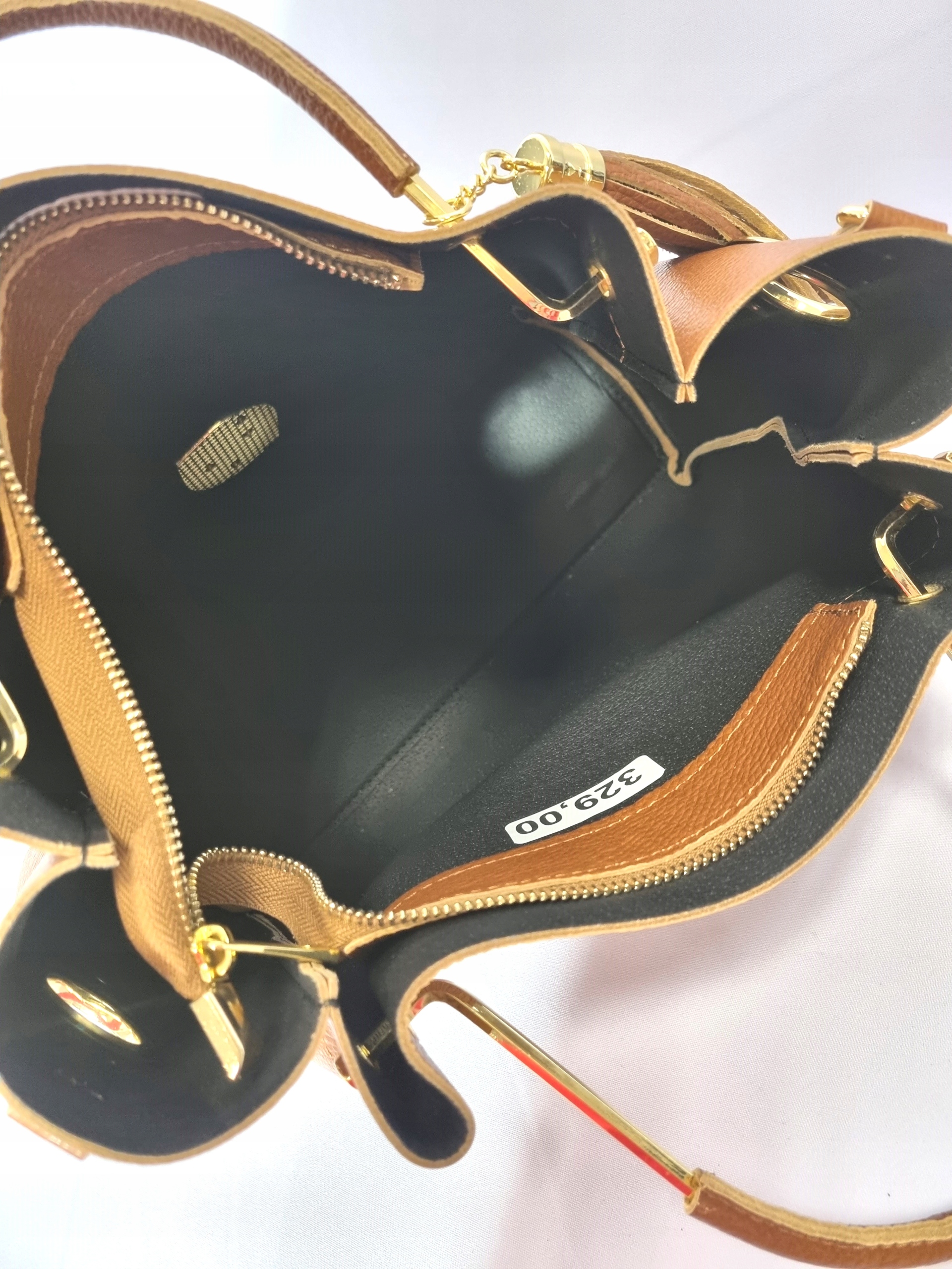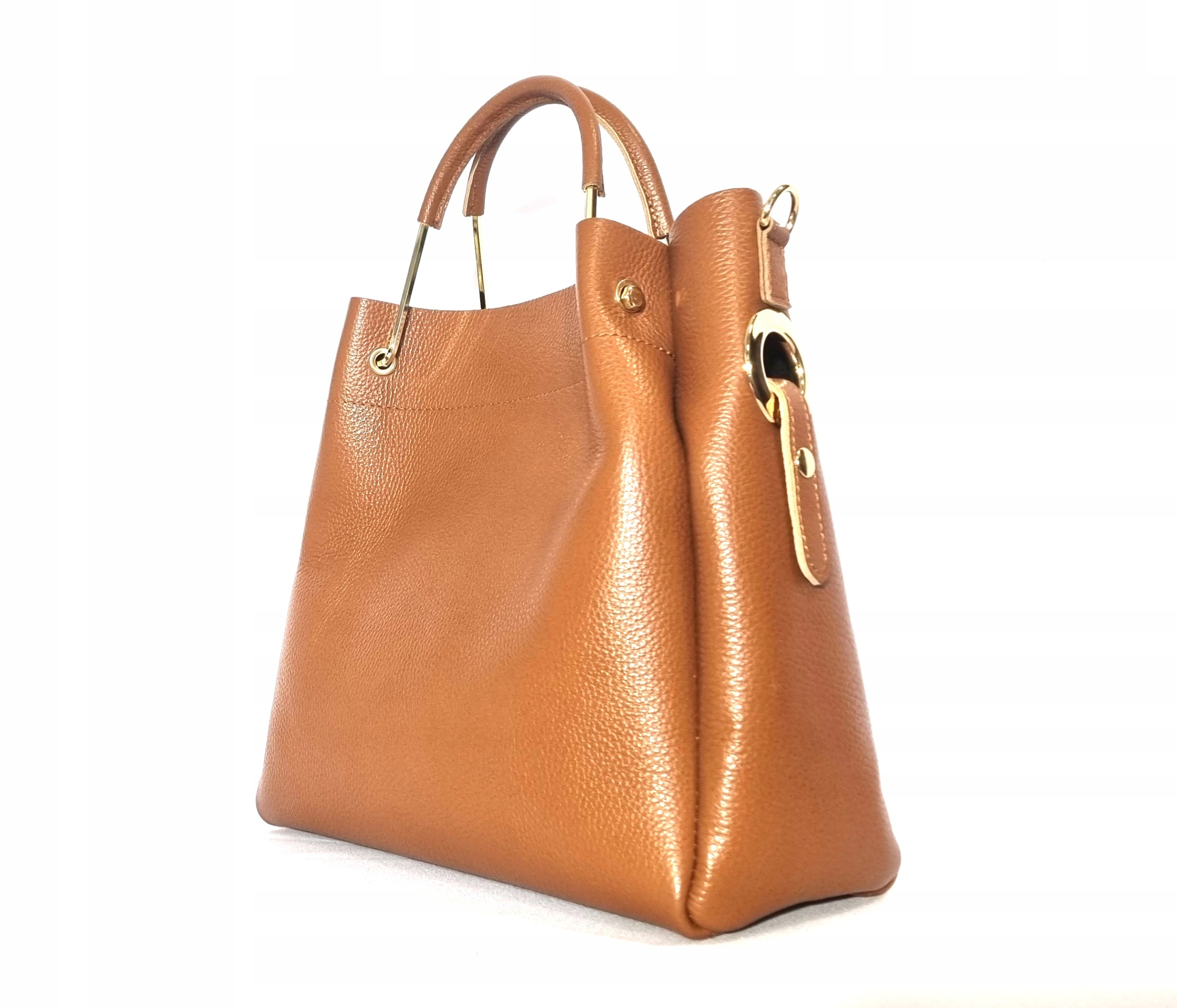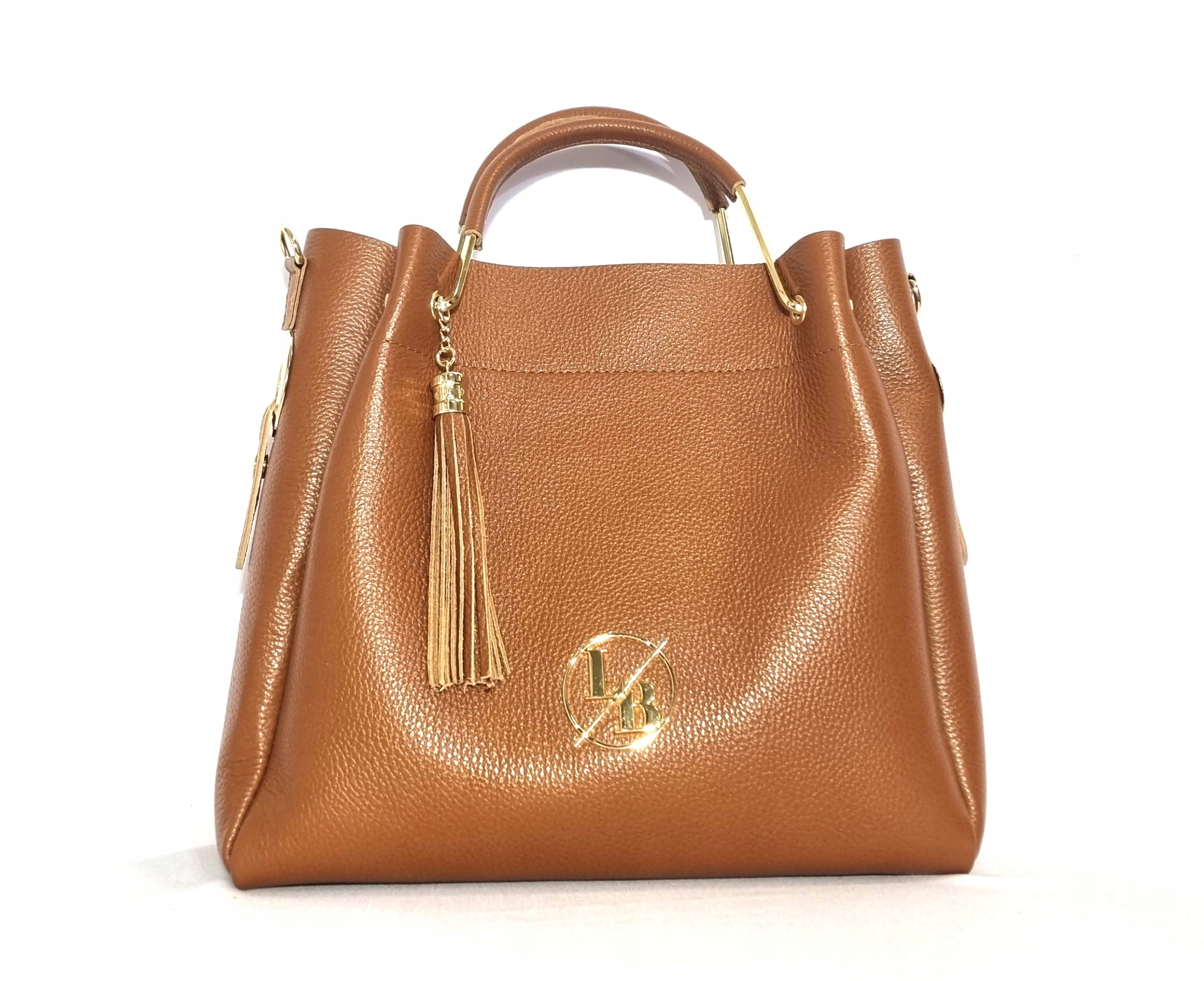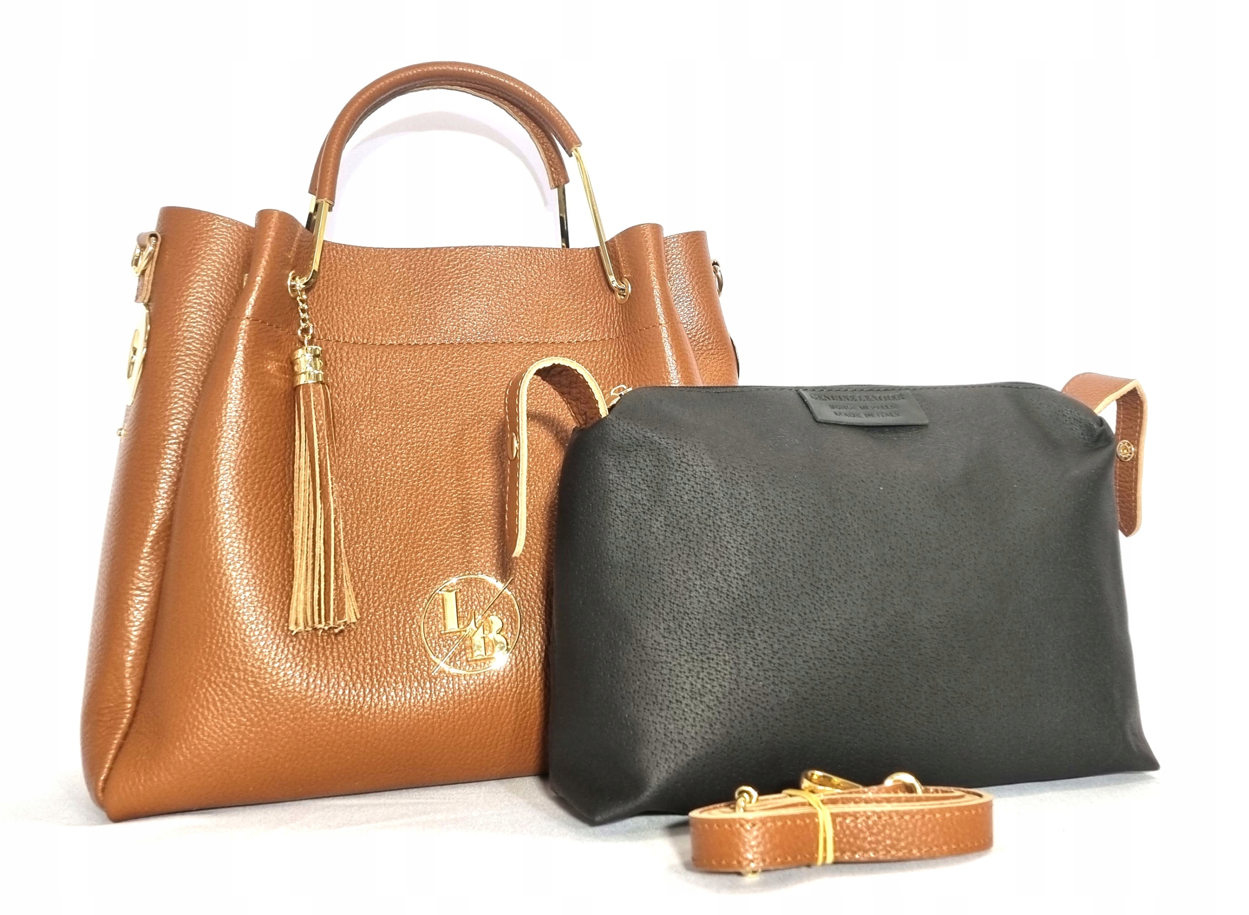 Przedstawiamy państwu brązową skórzaną torebkę marki LAURA BIAGGI. Torebka posiada jedną komorę. Wewnątrz torebki została umieszczona czarna kosmetyczka. Kosmetyczka wewnątrz została umieszczona poprzez zapięcie z boku do torebki. Można ją odpiąć. Do torebki został dołączony długi pasek w kolorze torebki.