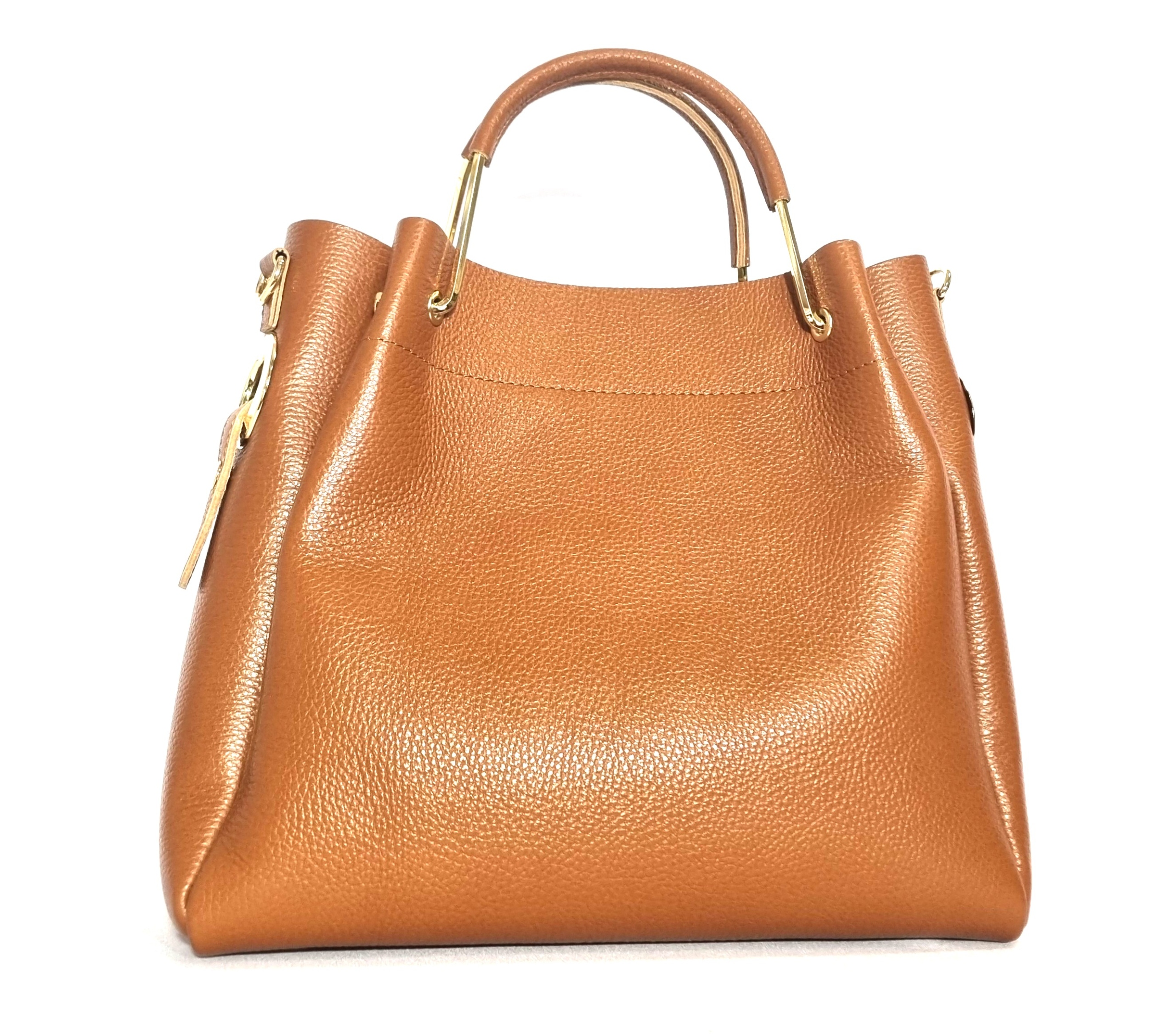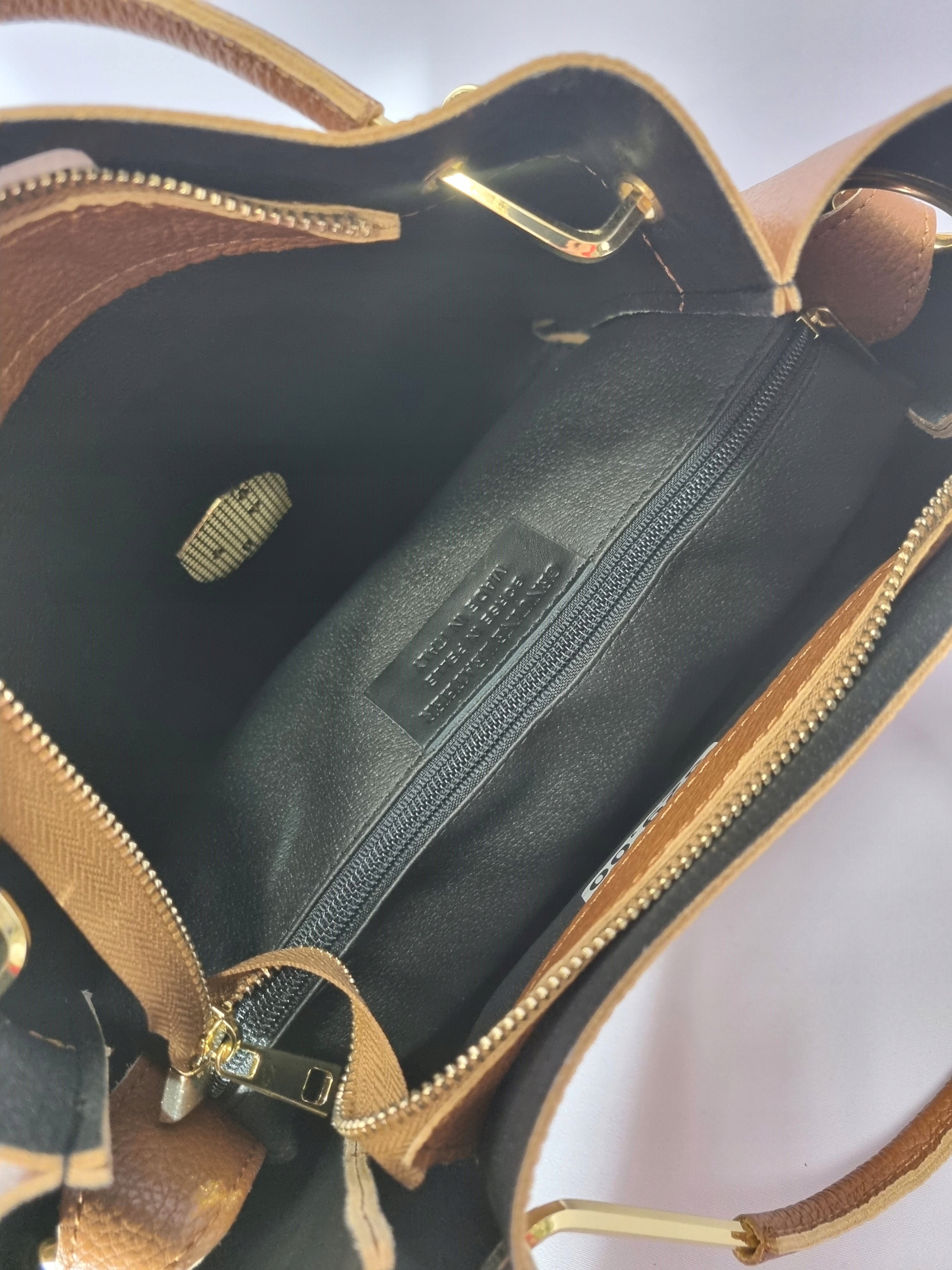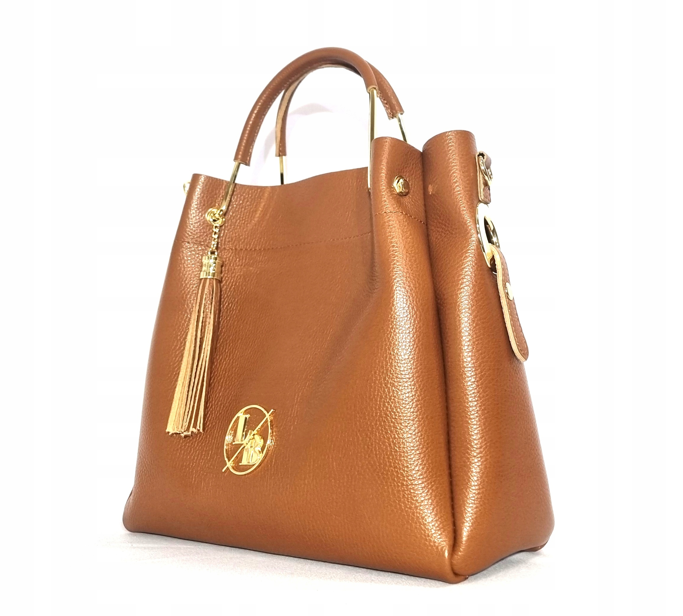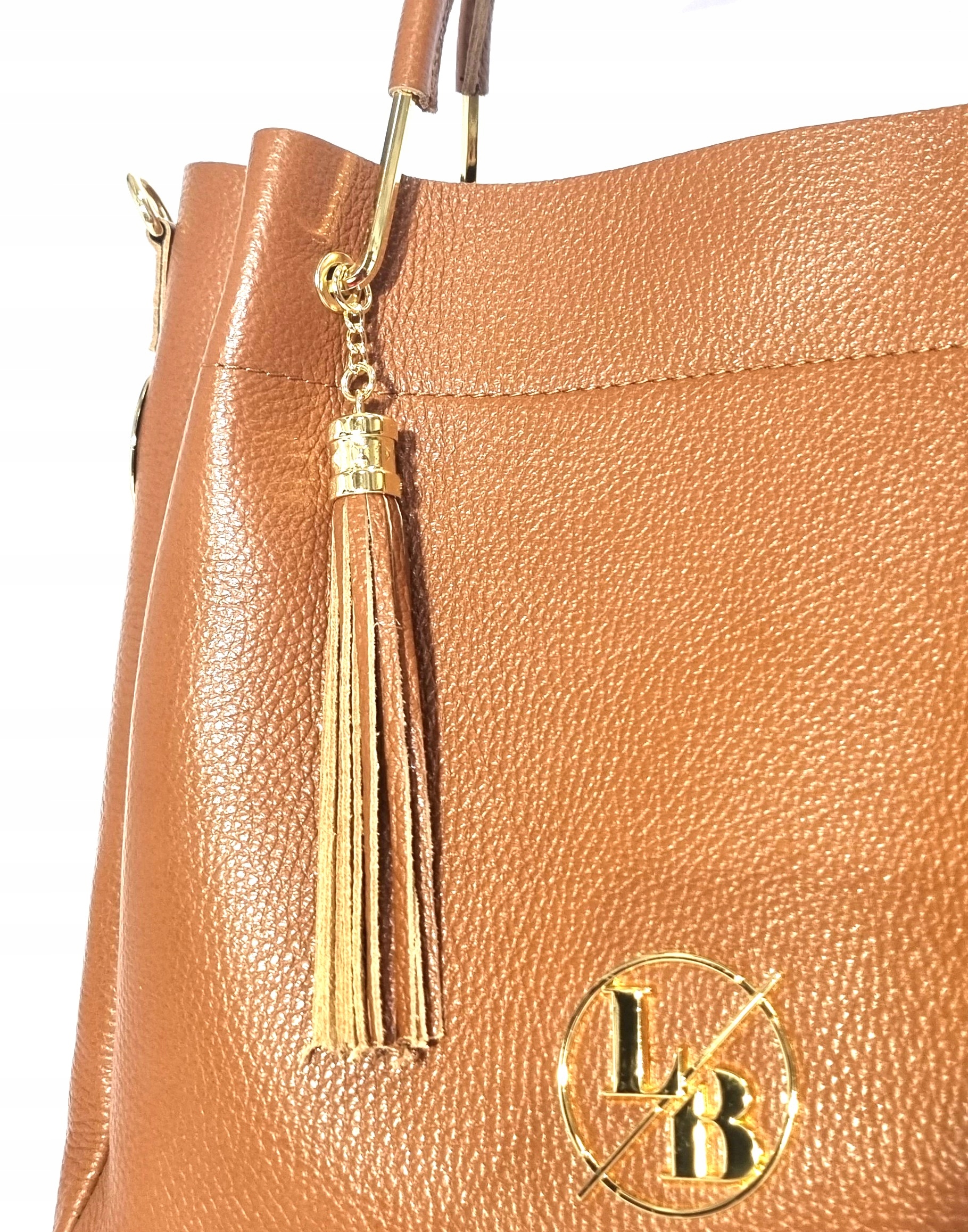 Przedstawiamy państwu brązową skórzaną torebkę marki LAURA BIAGGI. Torebka posiada jedną komorę. Wewnątrz torebki została umieszczona czarna kosmetyczka. Kosmetyczka wewnątrz została umieszczona poprzez zapięcie z boku do torebki. Można ją odpiąć. Do torebki został dołączony długi pasek w kolorze torebki.