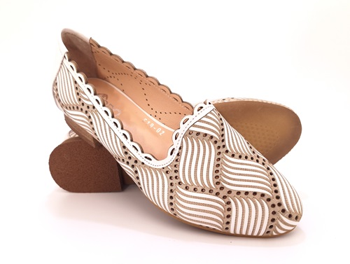 Szukasz obuwia, które łączy w sobie wygodę, elegancję i niepowtarzalny design? Postaw na damskie mokasyny marki Modo w koloże beżowym. Mokasyny zostały wykonane ze skóry naturalnej, co gwarantuje trwałość i wygodę. Cholewka ażurowa o oryginalnym wzorze przyciąga wzrok i nadaje butom niepowtarzalny charakter. Wygodę podczas chodzenia odczujesz dzięki skórzanej wyściółce. Wkładka miękka, także skórzana zapewnia komfort noszenia przez cały dzień. Usztywniony zapiętek gwarantuje stabilność. Mokasyny zostały osadzone na mierzącej 0,2 cm podeszwie z obcasem o wysokości 2 cm.