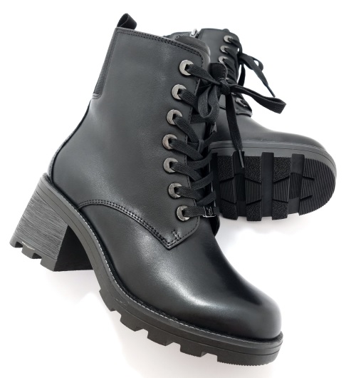 - Botki na obcasie damskie wykonane z naturalnej skóry licowej, ocieplone wewnątrz futrzanym kocem obuwniczym. Model zasuwany oraz sznurowany.