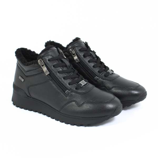 - Czarne damskie sneakersy ocieplane, wykonane ze skóry naturalnej. Specjalna powłoka TEX chroni obuwie przed wodą.