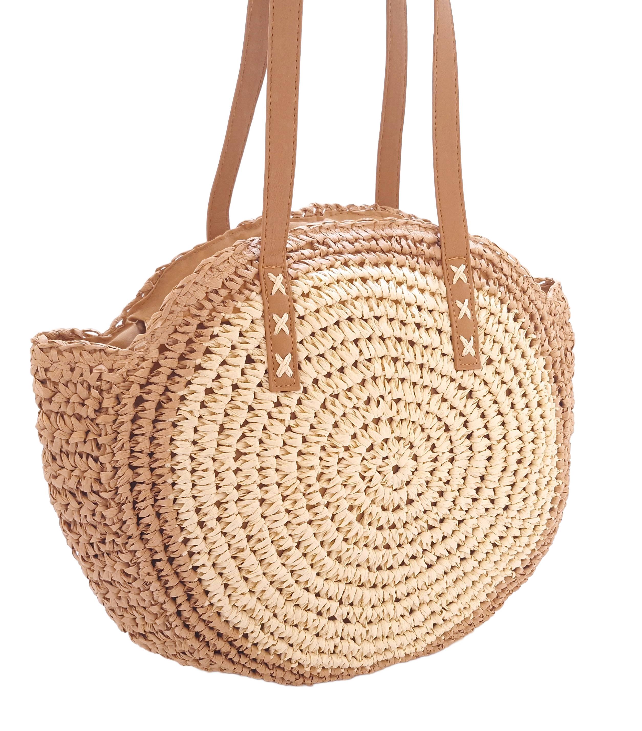 Stylowa i modna letnia torebka z plecionki w okrągłym kształcie. Wykonana z plecionej słomki papierowej w brązowo-beżowym kolorze. Torebka jest lekka i przewiewna. Komora zamykana na zamek błyskawiczny pomieści wszystkie Twoje niezbędne rzeczy, a dodatkowa kieszonka idealnie nadaje się na telefon. Wnętrze wykończone jest podszewką, zapewniając komfort użytkowania. Wygodę użytkowania zapewniają dwa uchwyty z ekoskóry, idealne do noszenia torebki zarówno w dłoni, jak i na ramieniu.