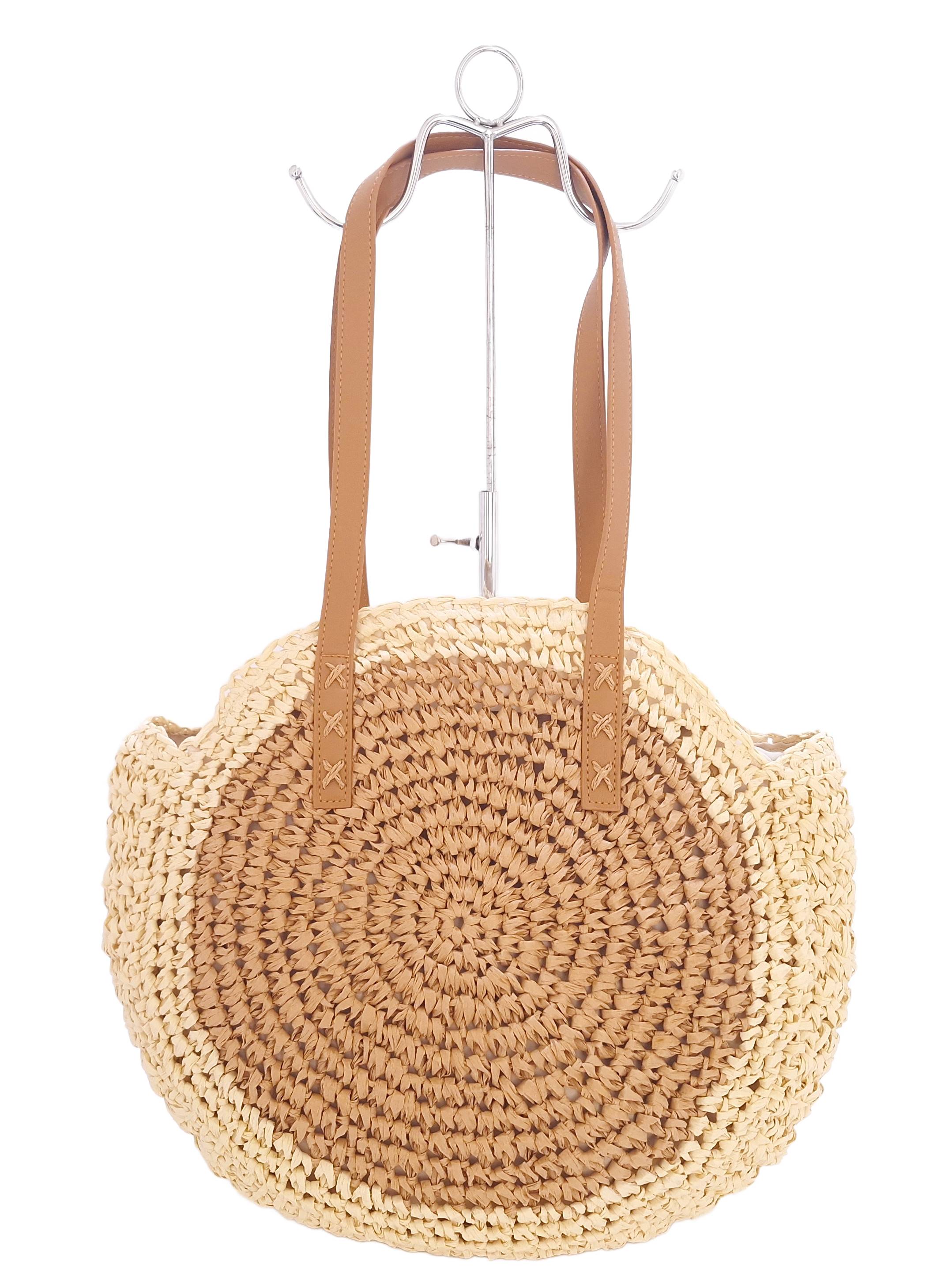 - Beżowa pleciona okrągła torebka z uchwytami, wykonana z papierowej rafii. Niezwykle lekka i pojemna. Zamykana na suwak.