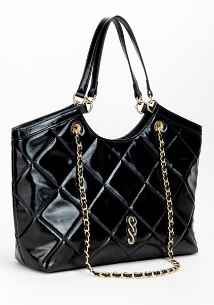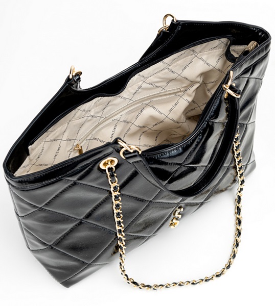 - Torebka shopperka wykonana z pikowanej ekoskóry w czarnym kolorze. Model jednokomorowy. Torba zawieszona na krótkich i długich rączkach.