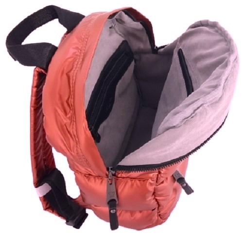 Plecak jest średniej wielkości. Zamykany jest za pomocą dyskretnego, dwukierunkowego zamka błyskawicznego. Posiada jedną główną komorę wykończoną miękką logowaną podszewką, chroniącą przedmioty przed zarysowaniem lub uszkodzeniem. Wewnątrz znajdziemy zamykaną na suwak kieszeń oraz jedną otwartą. Z przodu oraz z tyłu znajdziemy kieszonkę zamykaną na zamek. Frontową stronę plecaka zdobi logo Pepe Moll.