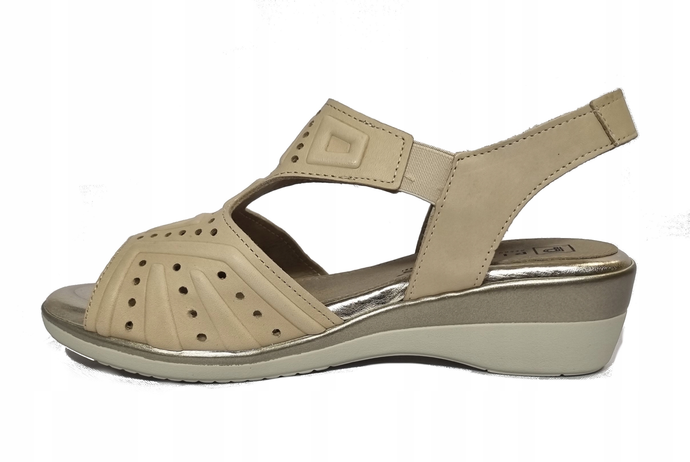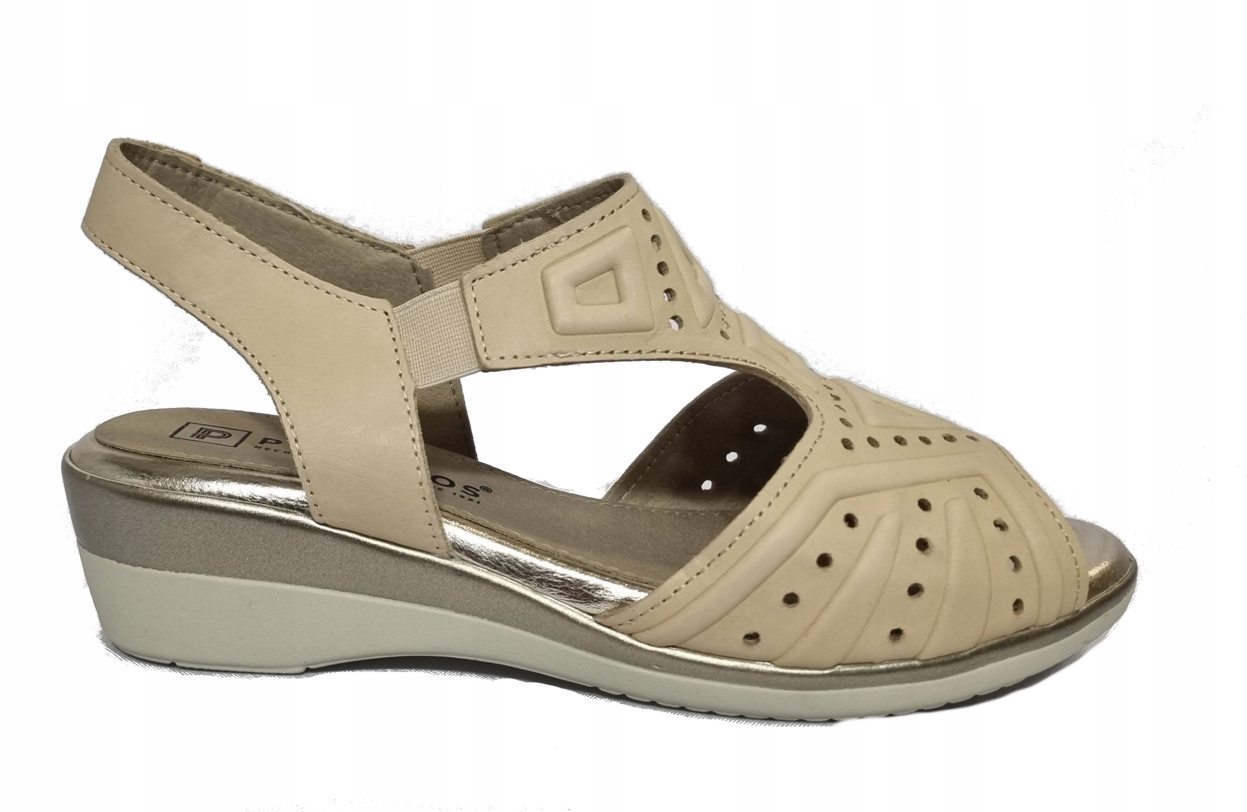 Przedstawiamy bardzo wygodne i efektowne sandałki w kolorze złotym na koturnie. Fason sprawdzi się przy haluksach, ponieważ dzieki szerokiemu paskowi bardzo ładnie je ukryje.