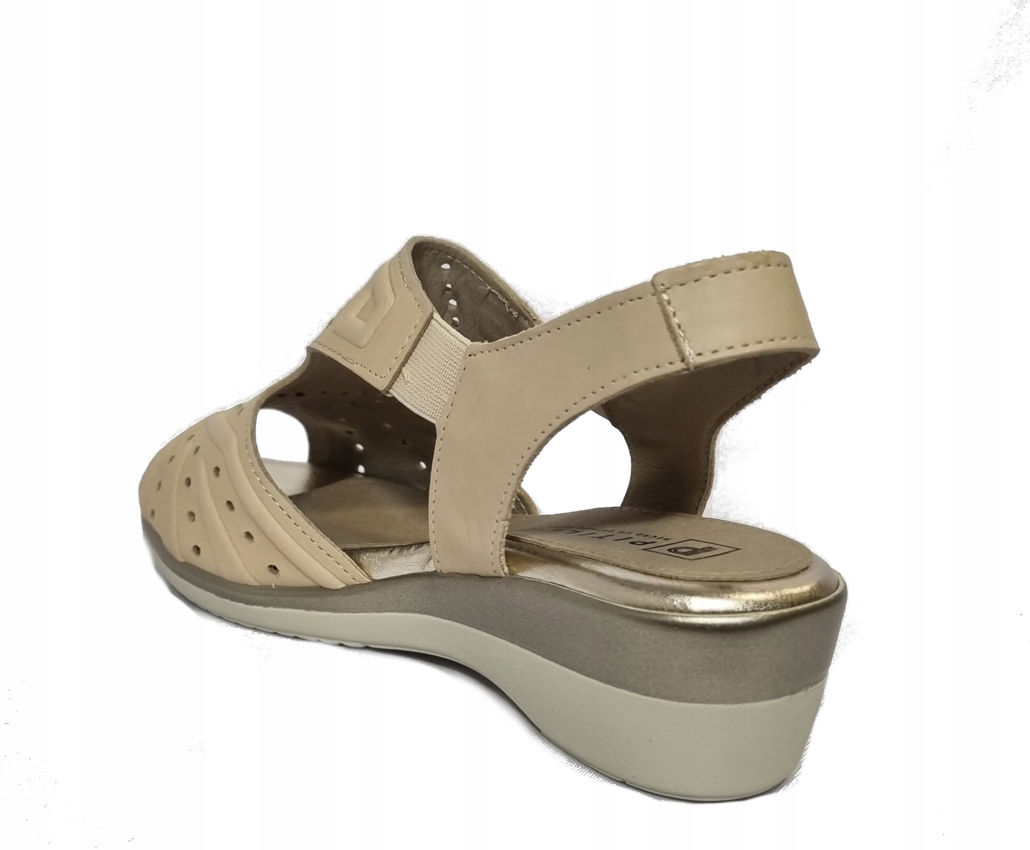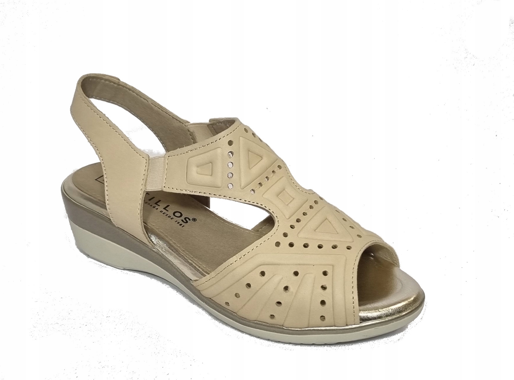 Przedstawiamy bardzo wygodne i efektowne sandałki w kolorze złotym na koturnie. Fason sprawdzi się przy haluksach, ponieważ dzieki szerokiemu paskowi bardzo ładnie je ukryje.