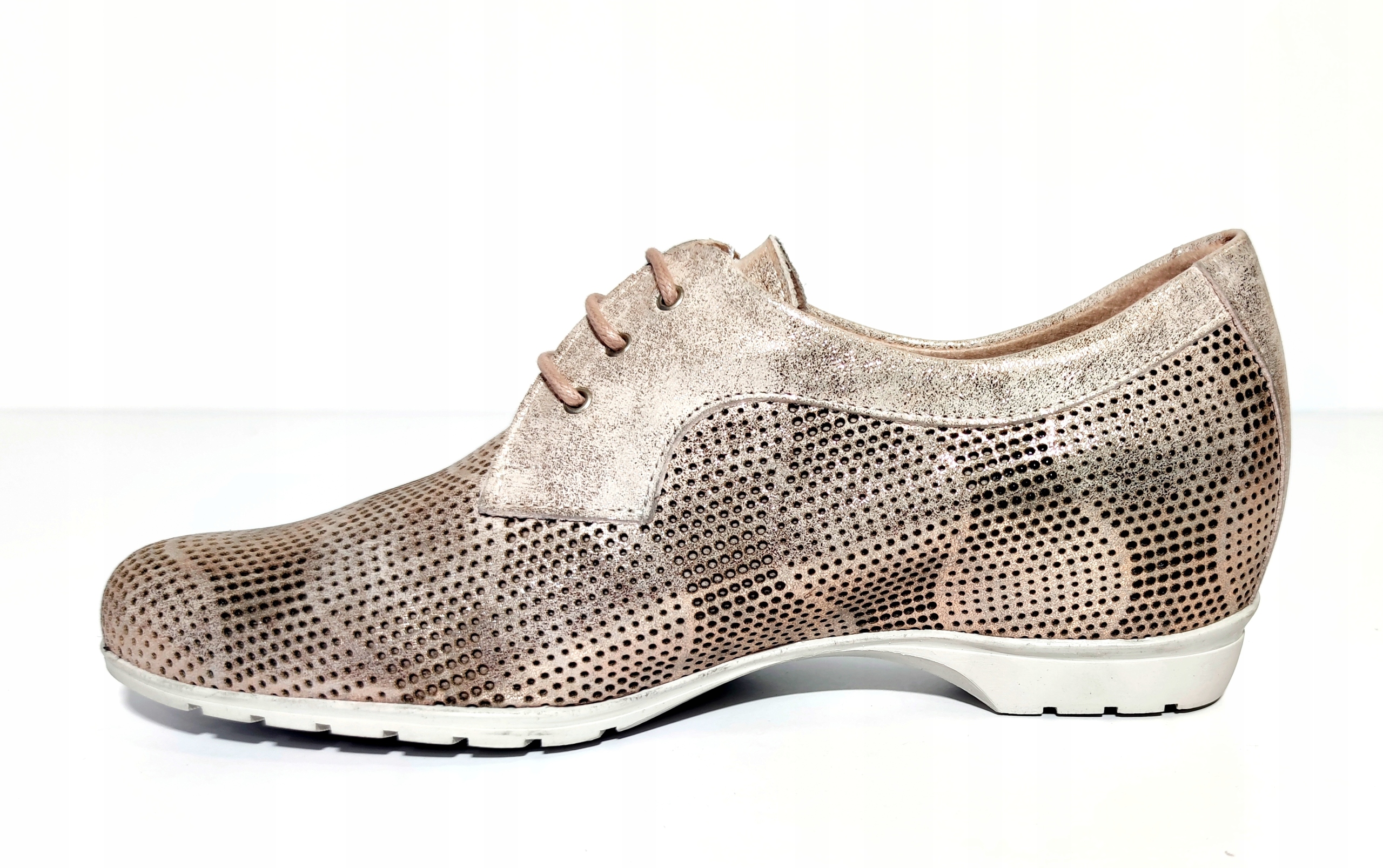 Przedstawiamy bardzo wygodne i efektowne półbuty na ukrytej koturnie w pięknym kolorze złoty róż.