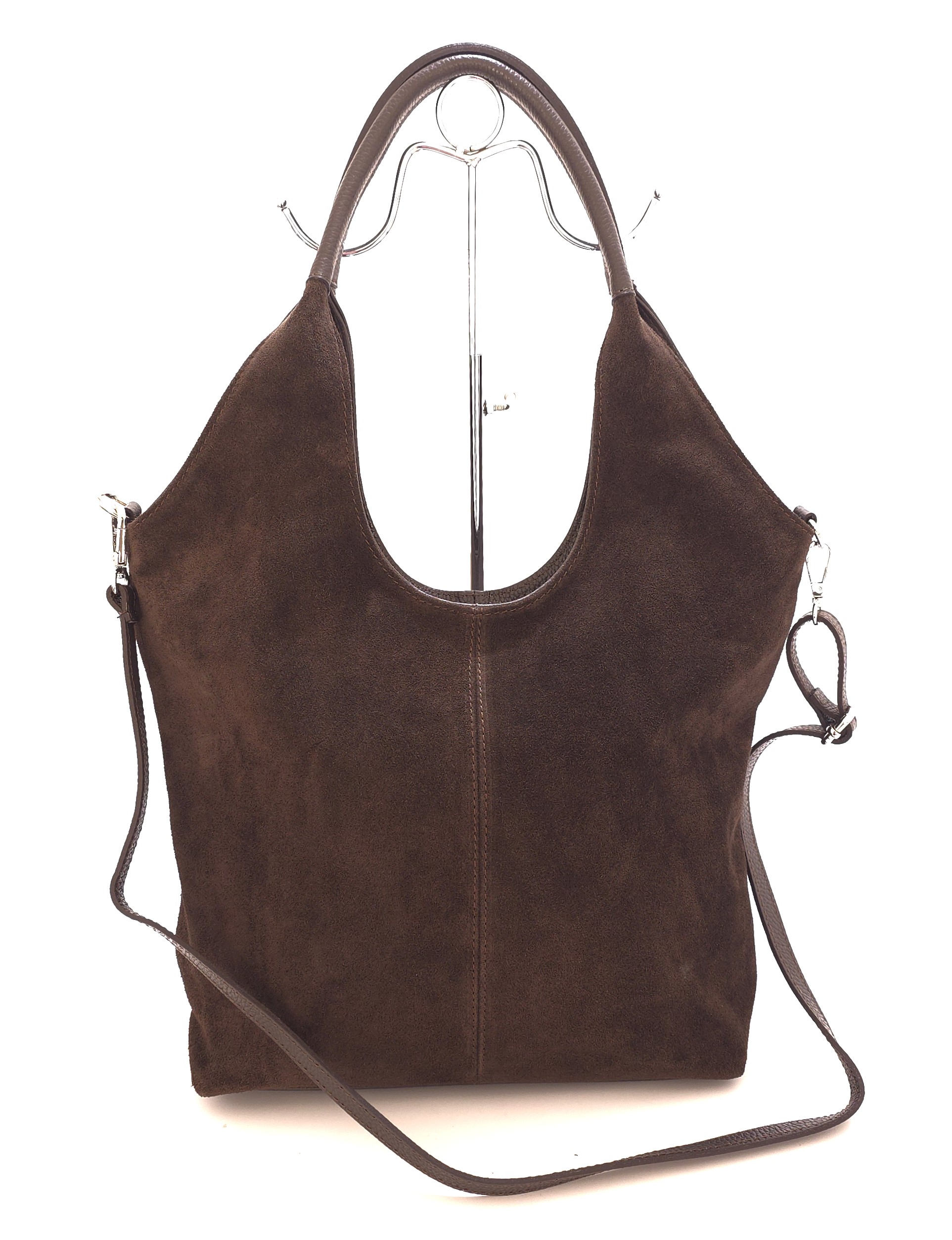 Skórzana torebka damska na ramię Vera Pelle wykonana z wysokiej jakości skóry naturalnej w odcieniu czekoladowego brązu. Przód torebki wykonany z miękkiego zamszu. Komora główna zamykana na zamek z dodatkowymi kieszeniami wewnątrz i na zewnątrz. Odpinany pasek oraz uchwyty pozwalają nośić torebkę w ręku, na ramieniu lub na ukos.