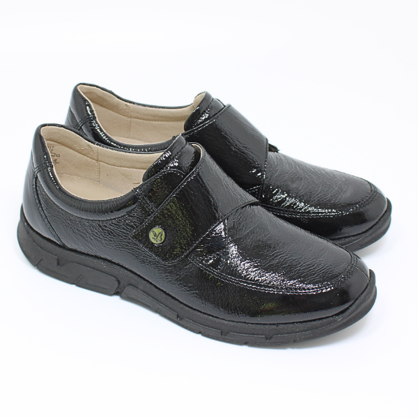 - Czarne lakierowane półbuty wykonane z naturalnej skóry. Obuwie posiada zapięcie na rzep.